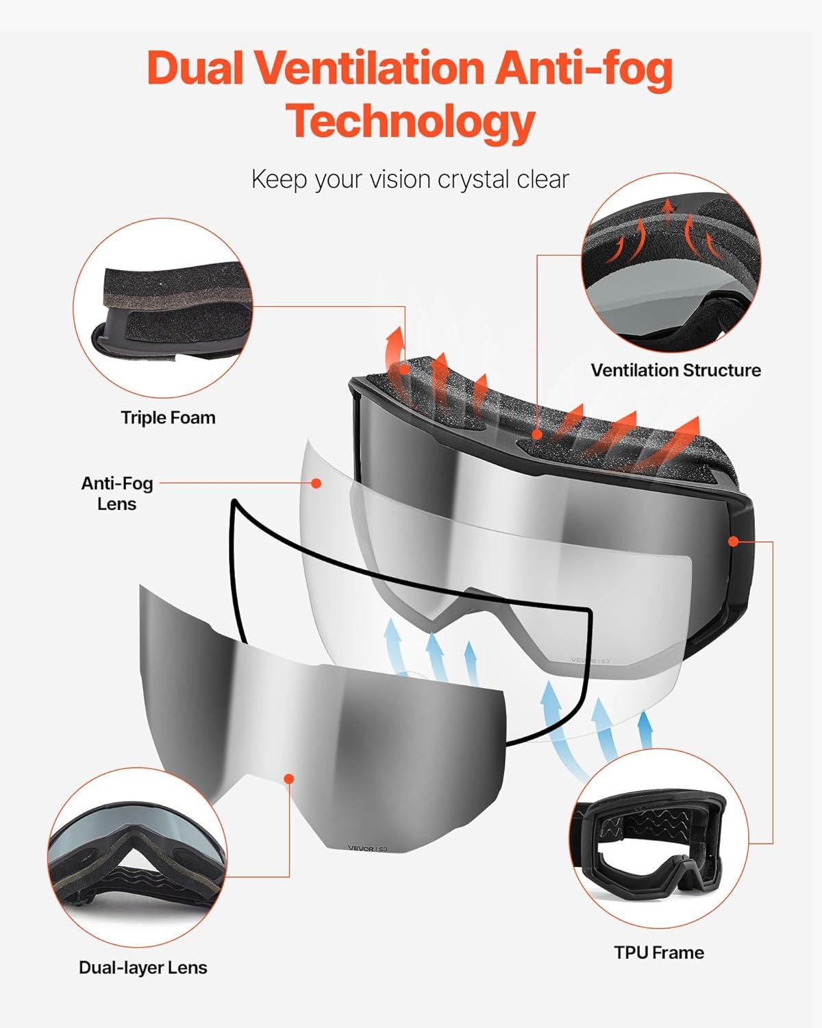 Dual Vent Anti-fog: Dual-layer lenses of the snowboard goggles resist fog from temp changes, while triple-layer foam adds warmth and comfort. Fast vents boost airflow, keeping vision crisp on steep runs