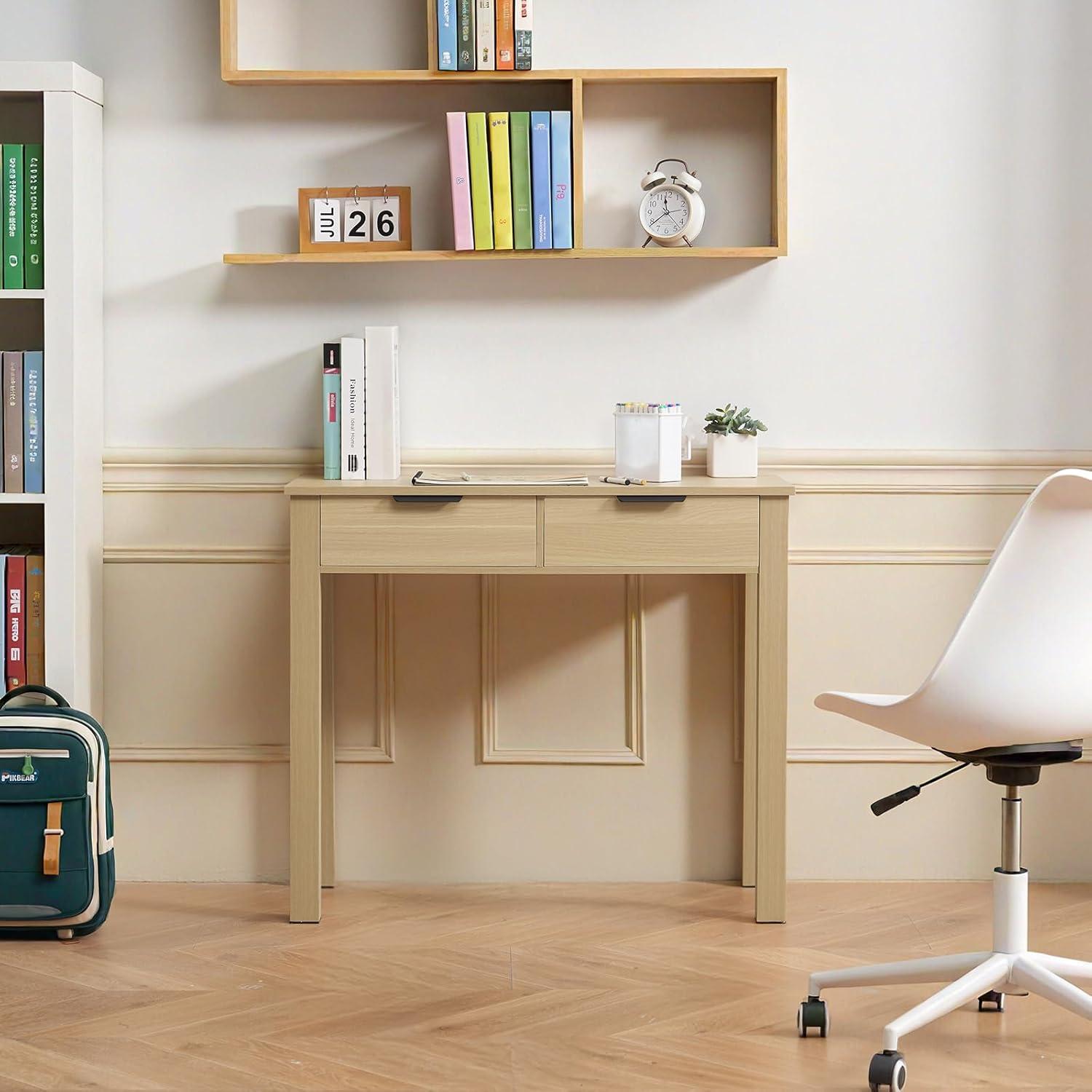 VEVOR Small Desk with Drawers, Kids Desk for Bedroom, Wooden Simple Study Table for Drawing, Reading, Writing, Rectangle MDF Furniture Study Storage Table for Home, Office, White + Wood(34.25"D x 15.55"W x 29.57"H)