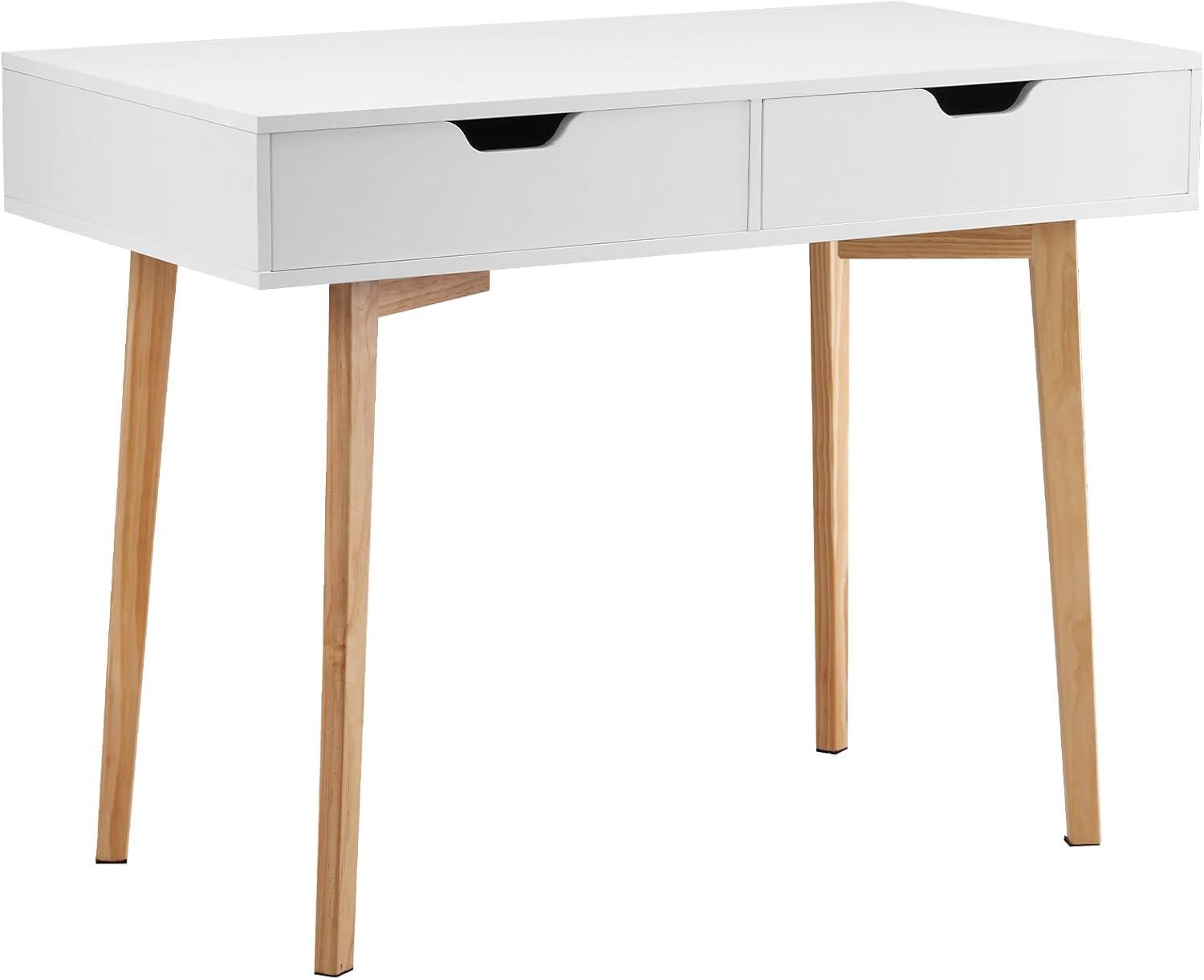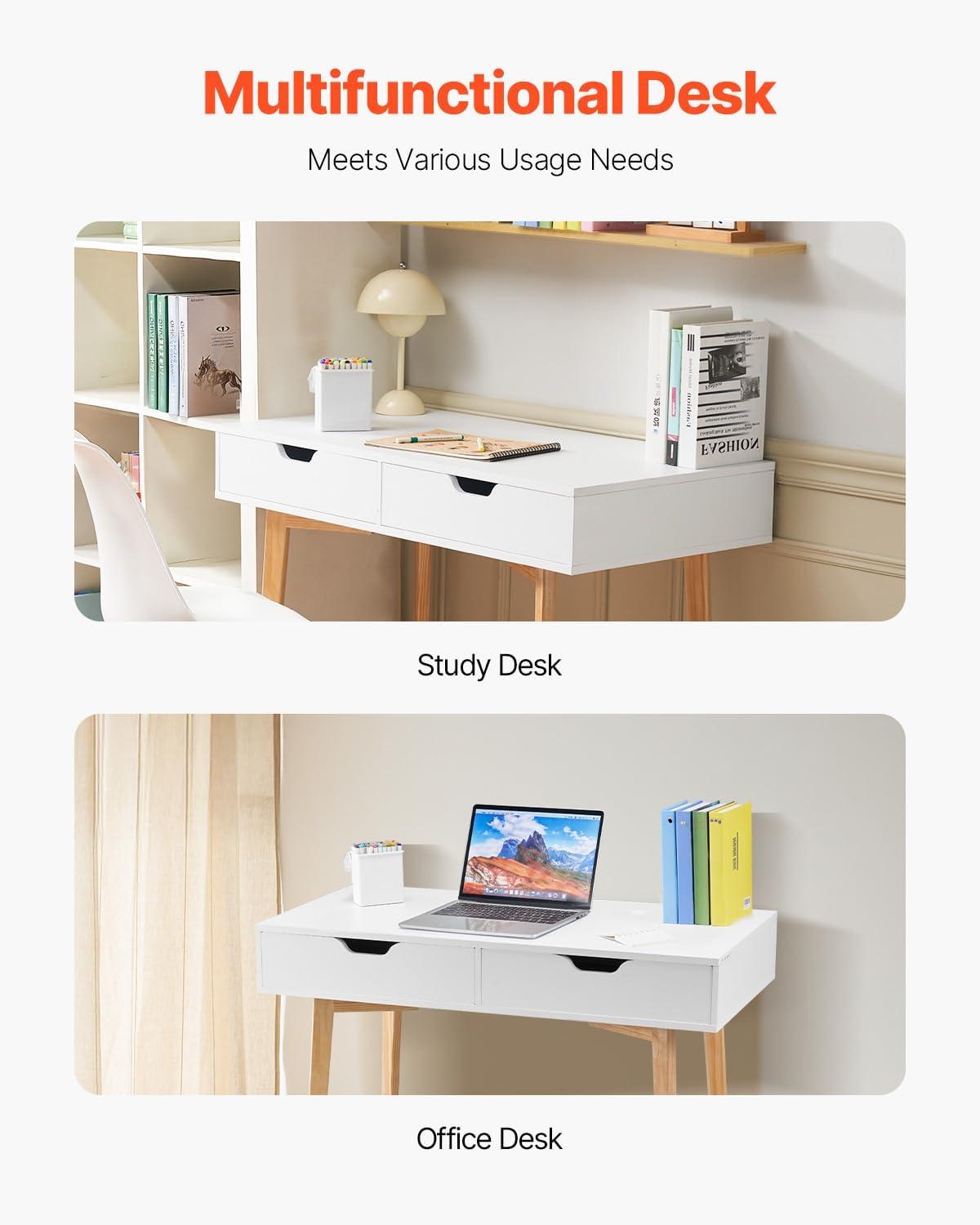 VEVOR Small Desk with Drawers, Kids Desk for Bedroom, Wooden Simple Study Table for Drawing, Reading, Writing, Rectangle MDF Furniture Study Storage Table for Home, Office, White + Wood(41.34″D x 17.32″W x 29.57″H)