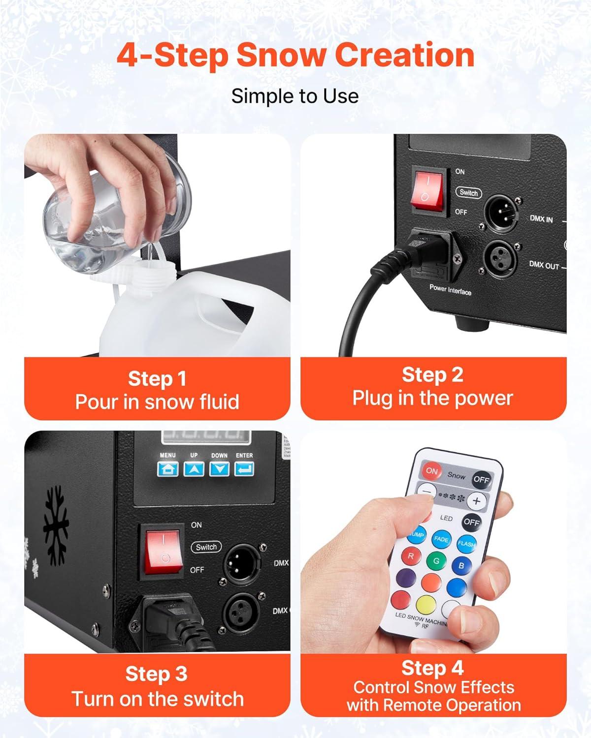 Stable Performance: Featuring an advanced electronic temperature control system and high-quality chips, the snow maker machine uses a high-pressure air pump to transform snow fluid (not included) into snowflakes. This system ensures stable, smooth performance for reliable operation.