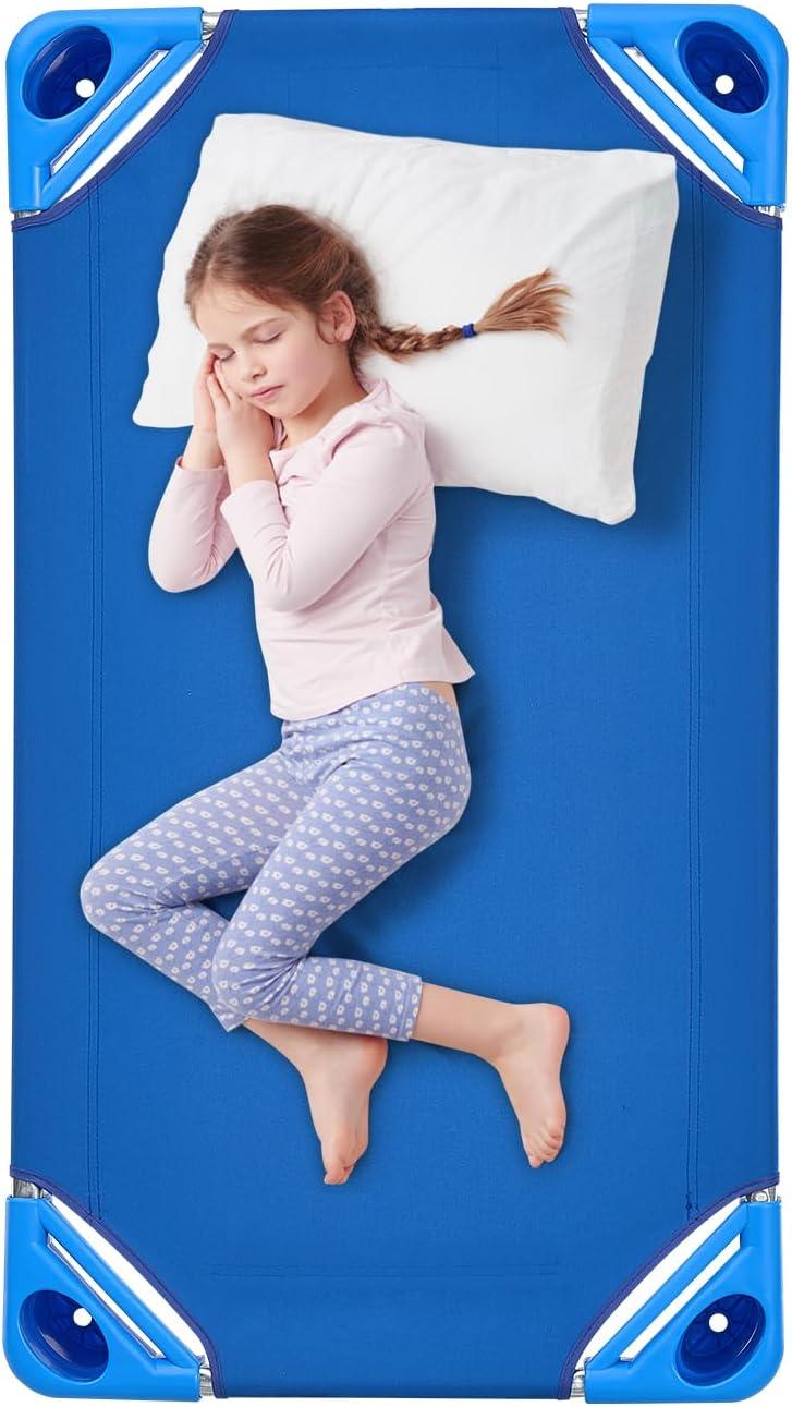Built to Last & Secure for Kids: The strong PP corners are tough and won’t crack easily, while the sturdy steel frame can hold up to 132 lbs / 60 kg—enough to support growing kids. These stackable nap cots meet CPSIA standards and feature rounded edges for extra sound. The tight-fitting Oxford fabric keeps little hands and feet protected while resting, so your kids can nap comfortably.