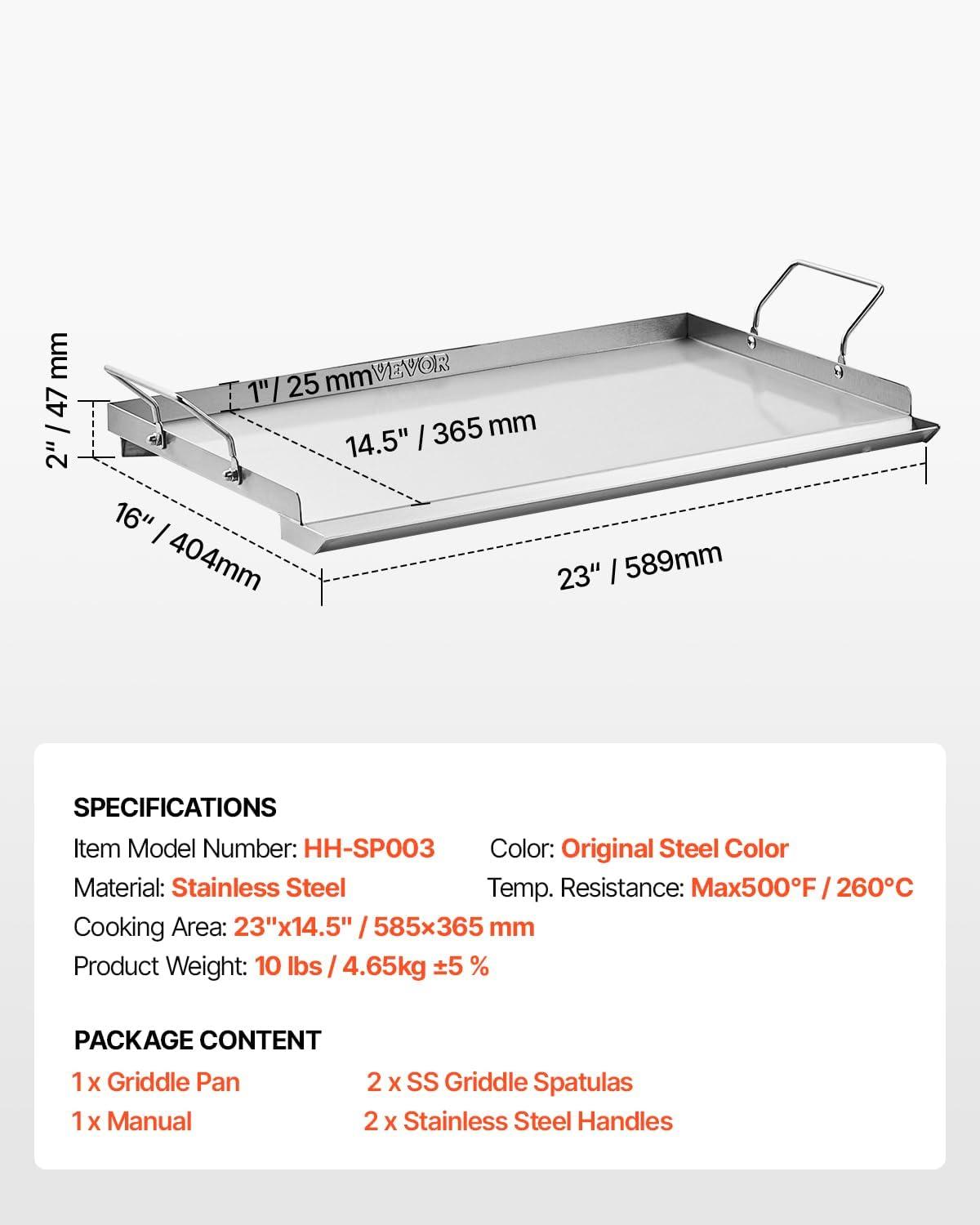 VEVOR Stainless Steel Griddle, 23×16 inch Universal Flat Top Rectangular Plate, Gas Grill Griddle for BBQ Grill, Teppanyaki, Portable Family Cookware with Handle, for Camping Tailgating Party(23.2″ x 15.9″ x 1.9″)