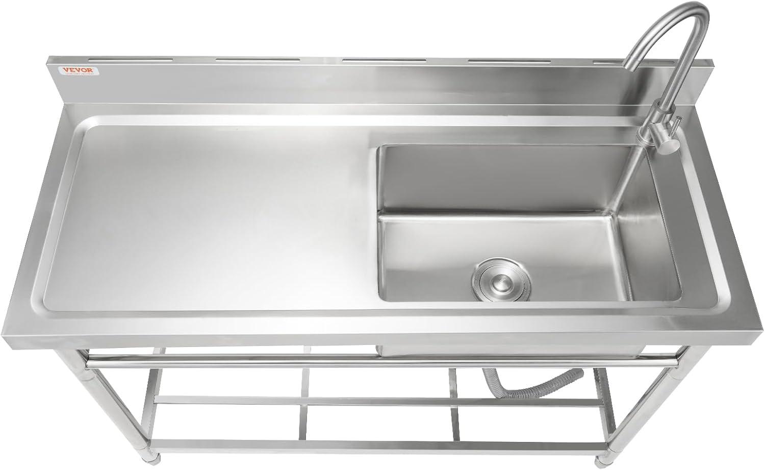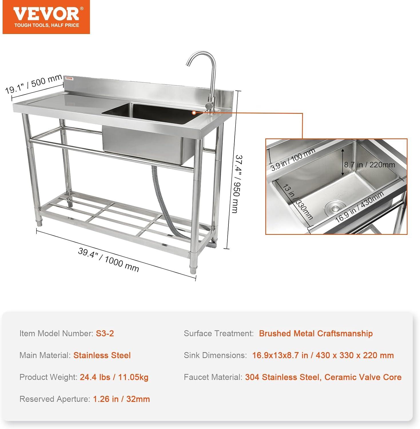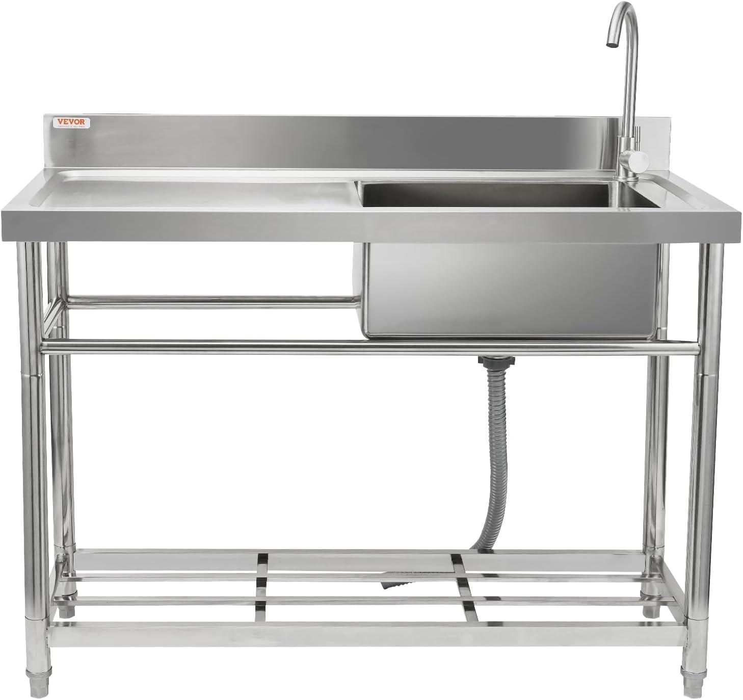 VEVOR Stainless Steel Utility Sink, 1 Compartment Free Standing Small Sink w/Workbench Faucet & legs, 39.4 x 19.1 x 37.4 in Commercial Single Bowl Sinks for Garage, Restaurant, Laundry(Silver - Right Single Bowl)