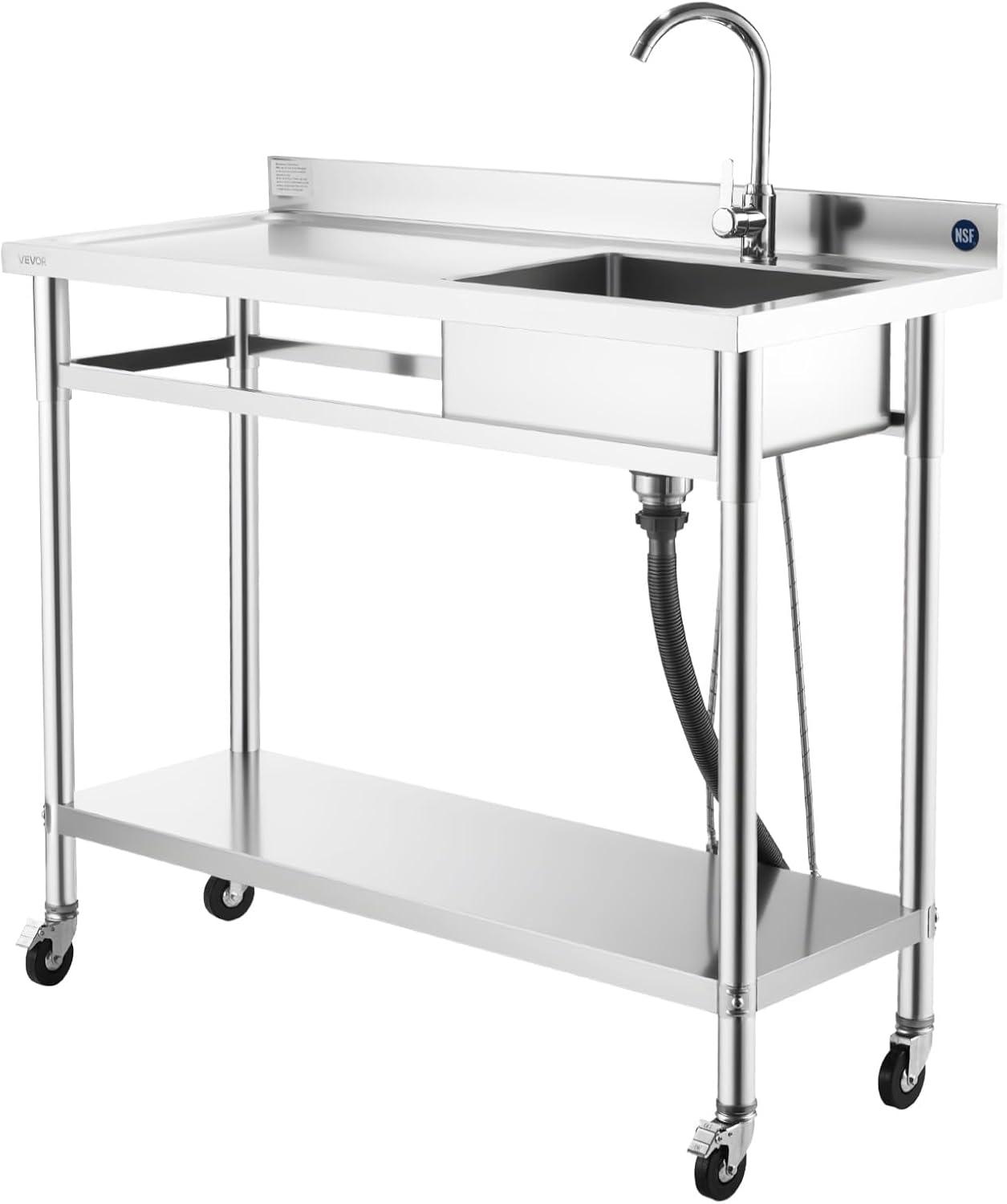 VEVOR Stainless Steel Utility Sink, Free Standing Single Bowl Commercial Kitchen Sink with Faucet, Utility Left Basin Workbench with Hot & Cold Water Pipe for Garage Restaurant Laundry, 47x19.7x37 in(47" Left Drainboard with Casters)