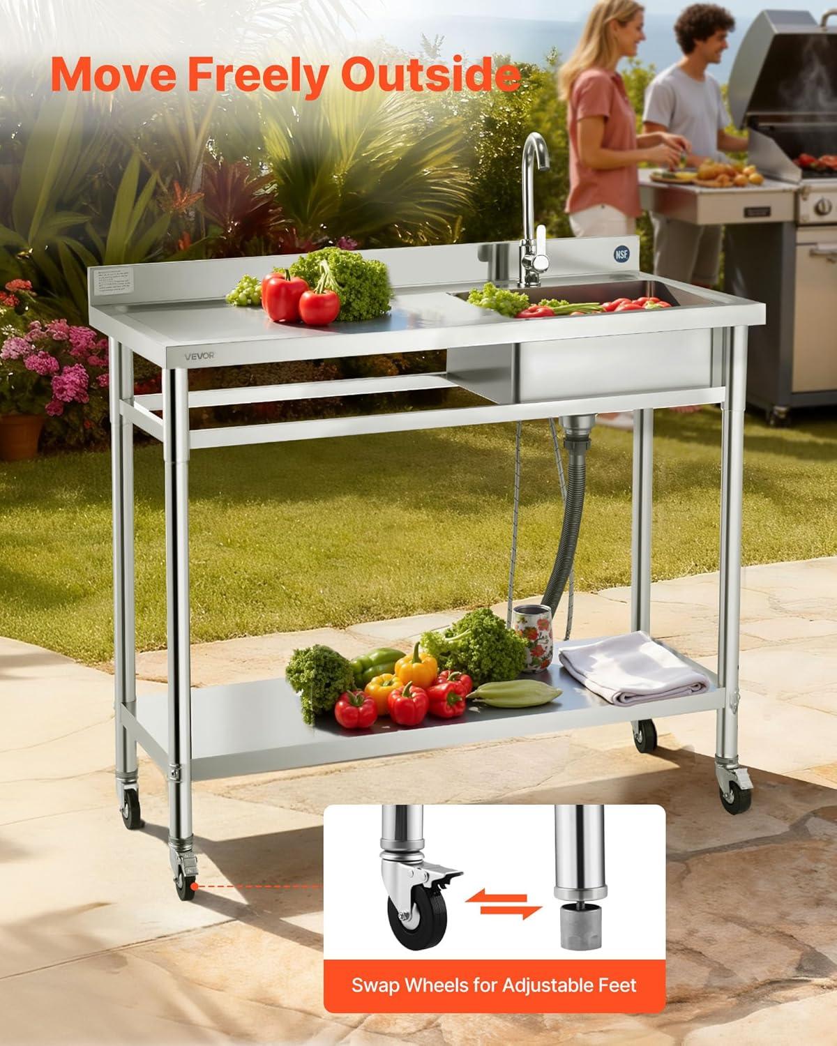 Versatile Use & Flexible Setup: Ideal for outdoor kitchen, patio, garage, bar, restaurant, or buffet. The commercial sink features adjustable feet ensure balance on uneven ground