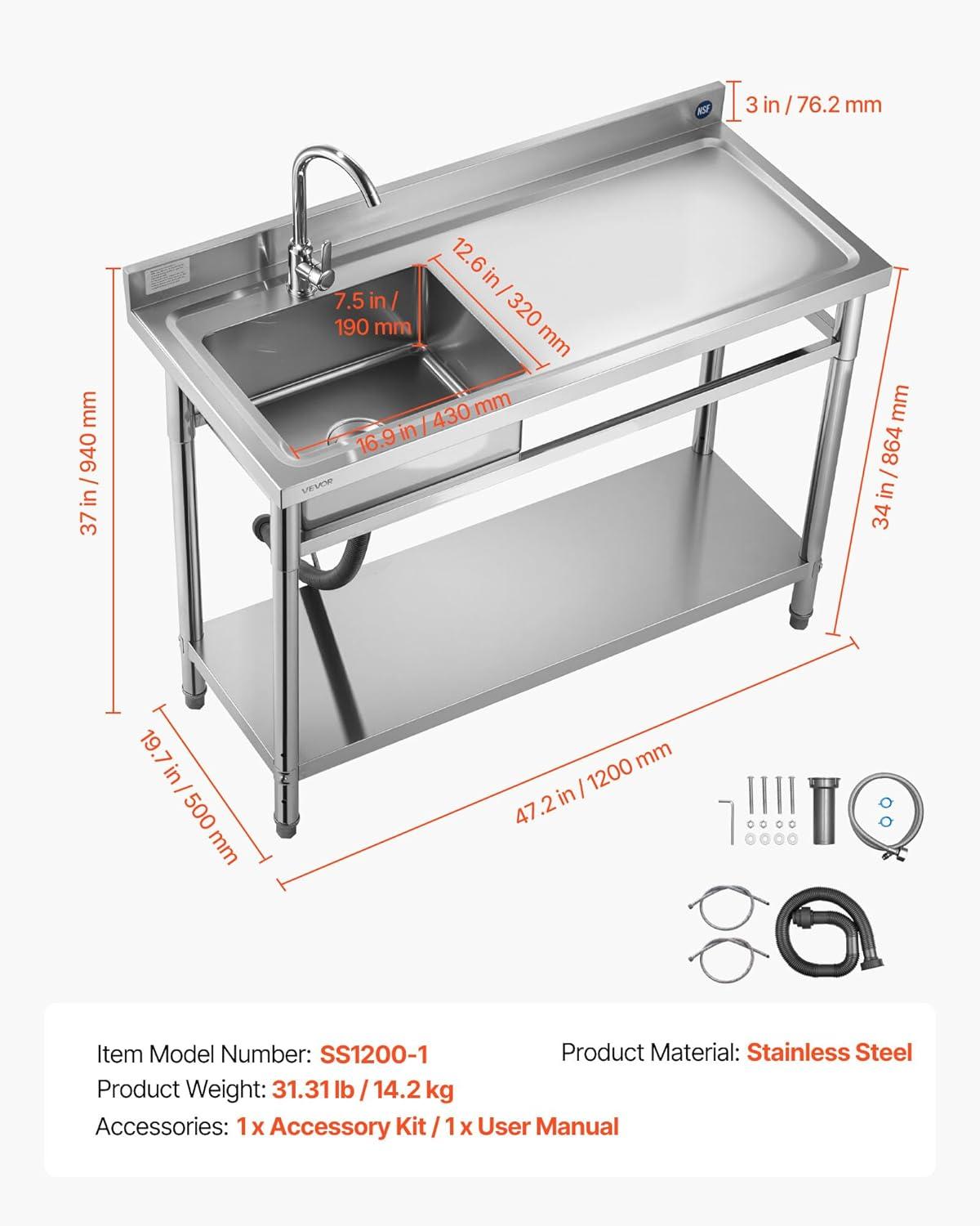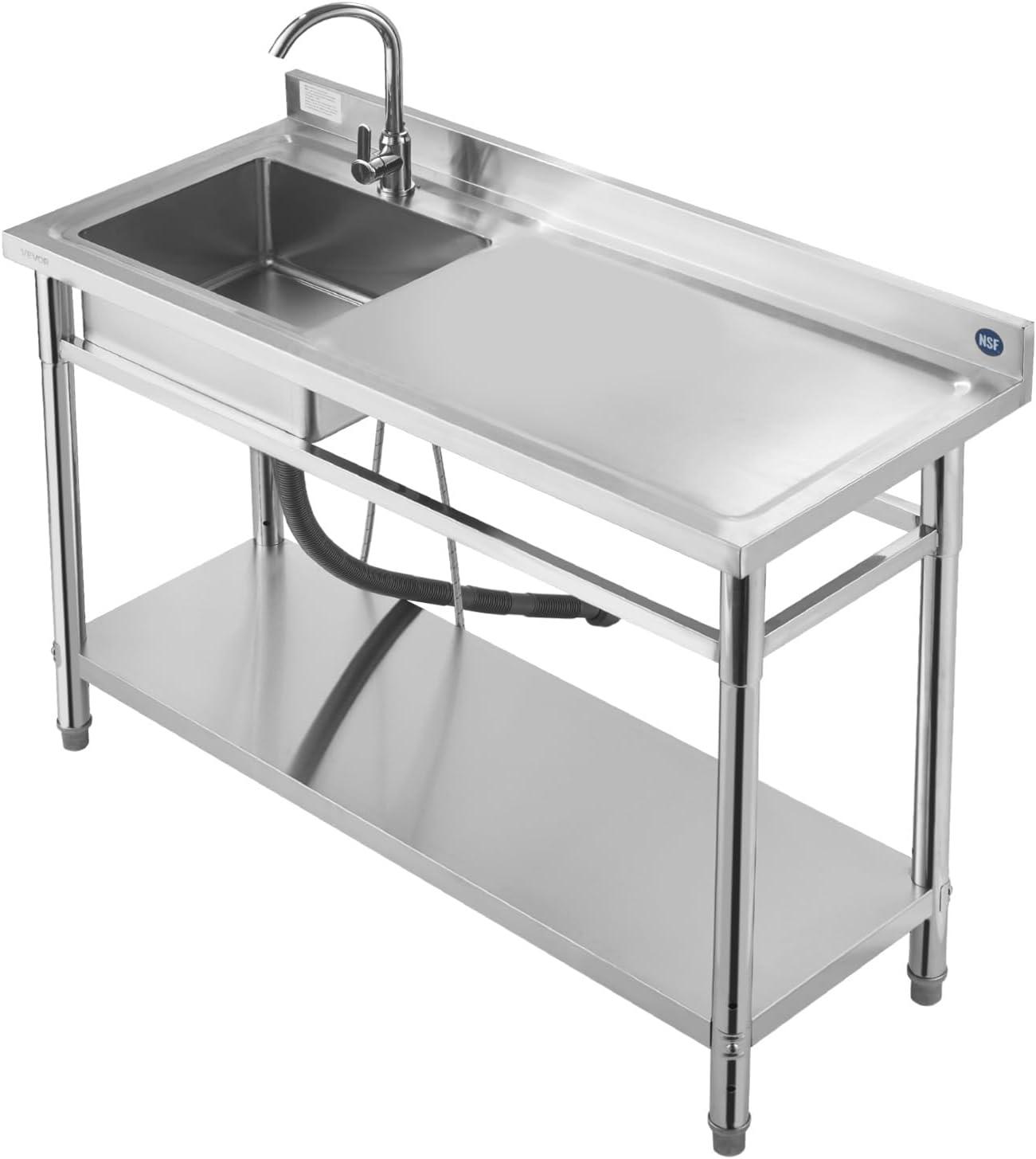 VEVOR Stainless Steel Utility Sink, Free Standing Single Bowl Commercial Kitchen Sink with Faucet, Utility Left Basin Workbench with Hot & Cold Water Pipe for Garage Restaurant Laundry, 47x19.7x37 in(47" Right Drainboard)