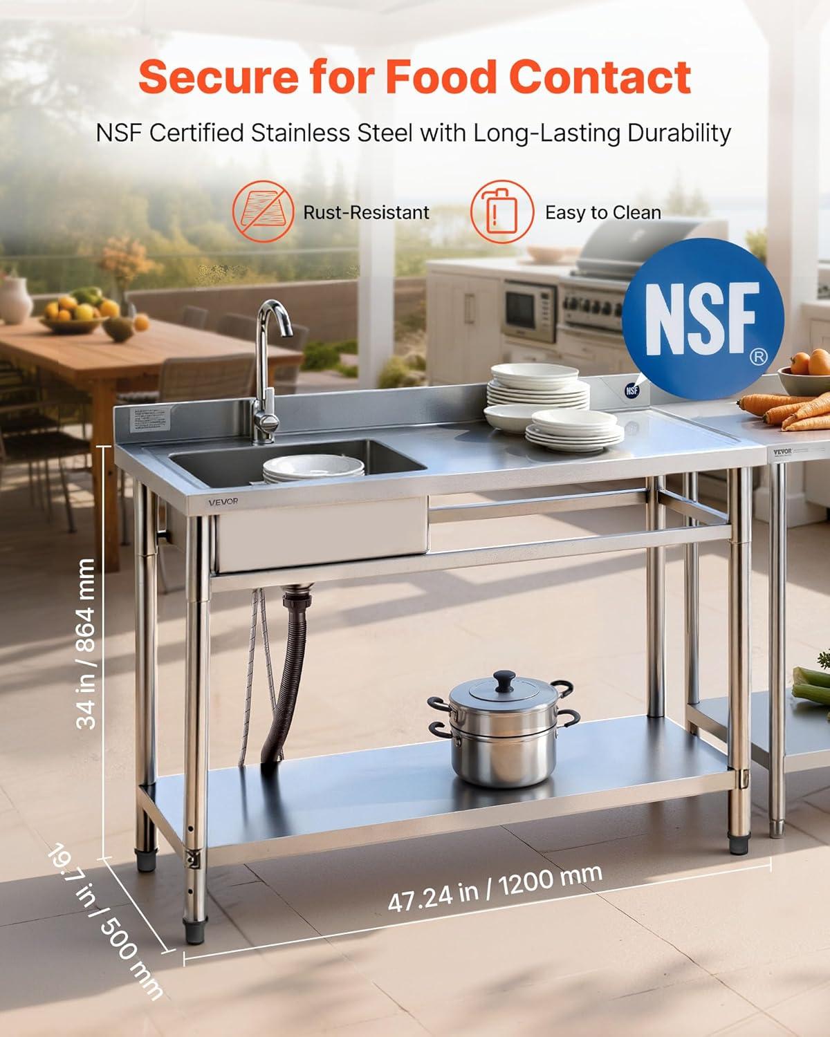 Versatile Use & Flexible Setup: Ideal for outdoor kitchen, patio, garage, bar, restaurant, or buffet. The commercial sink features adjustable feet ensure balance on uneven ground