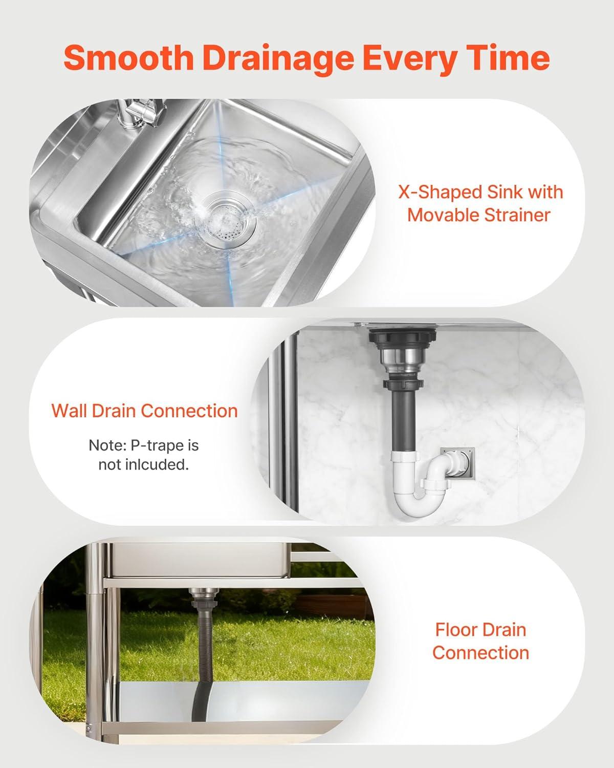 Anti-Clog Drainage System: Multi-layer sealed drain with removable strainer basket avoids food residue from clogging pipes. This stainless utility sink includes both short pipe and long hose to adapt to different drain needs