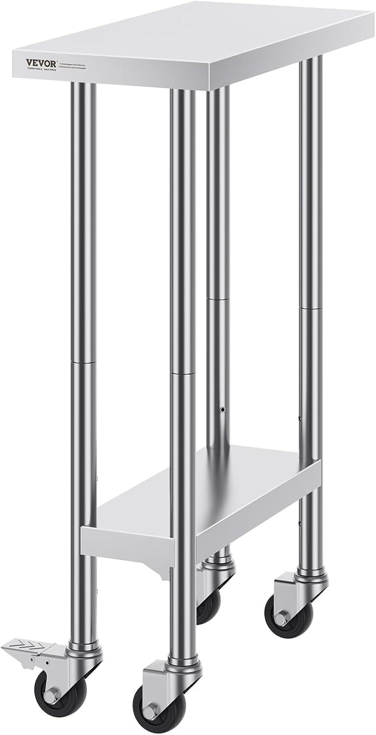 VEVOR Stainless Steel Work Table 30 x 48 x 38 Inch, with 4 Wheels, 3 Adjustable Height Levels, Heavy Duty Food Prep Worktable for Commercial Kitchen Restaurant, Silver(24 x 12 x 38 Inch)