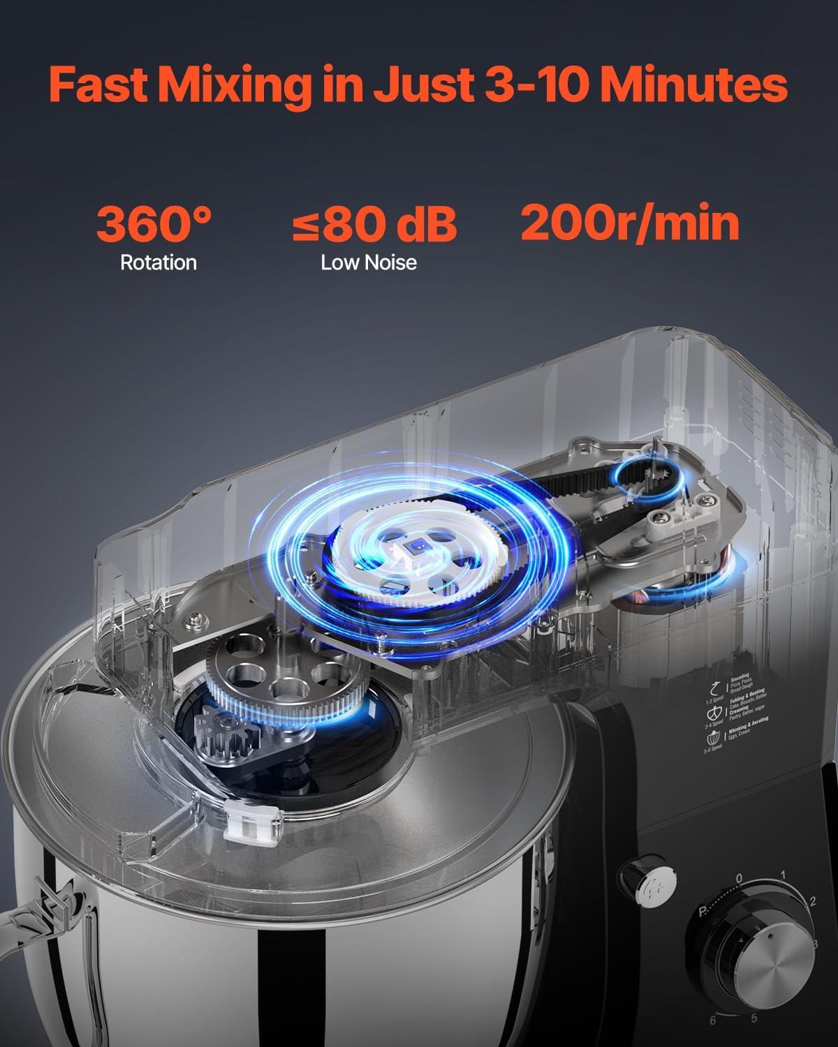 Quick Cleanup & Easy Disassembly: Thanks to the lever adjustment for tilting the head, our food mixer allows for easy attachment and detachment of mixing tools. Simply twist the bowl and then you can detach it. All food-contact components, including the bowl, hook, and rod, are made of food-grade stainless steel, ensuring durability, rust resistance, and easy cleaning.