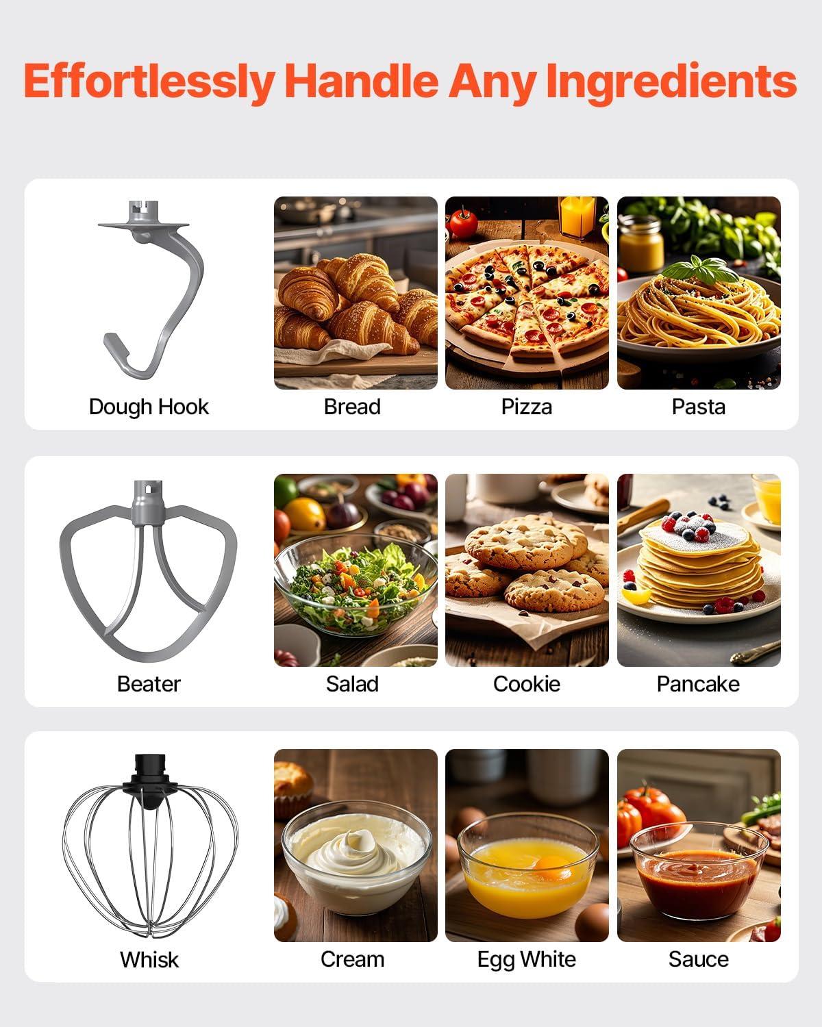 Complete Mixing Solution: Ready to tackle anything in the kitchen! Our stand mixer features 3 professional mixing attachments: a dough hook for effortlessly kneading pizza or other heavy dough, a flat beater for whipping up mashed potatoes, cake batters, or frosting, and a whisk for creating light mixtures like fluffy whipped cream or egg whites.