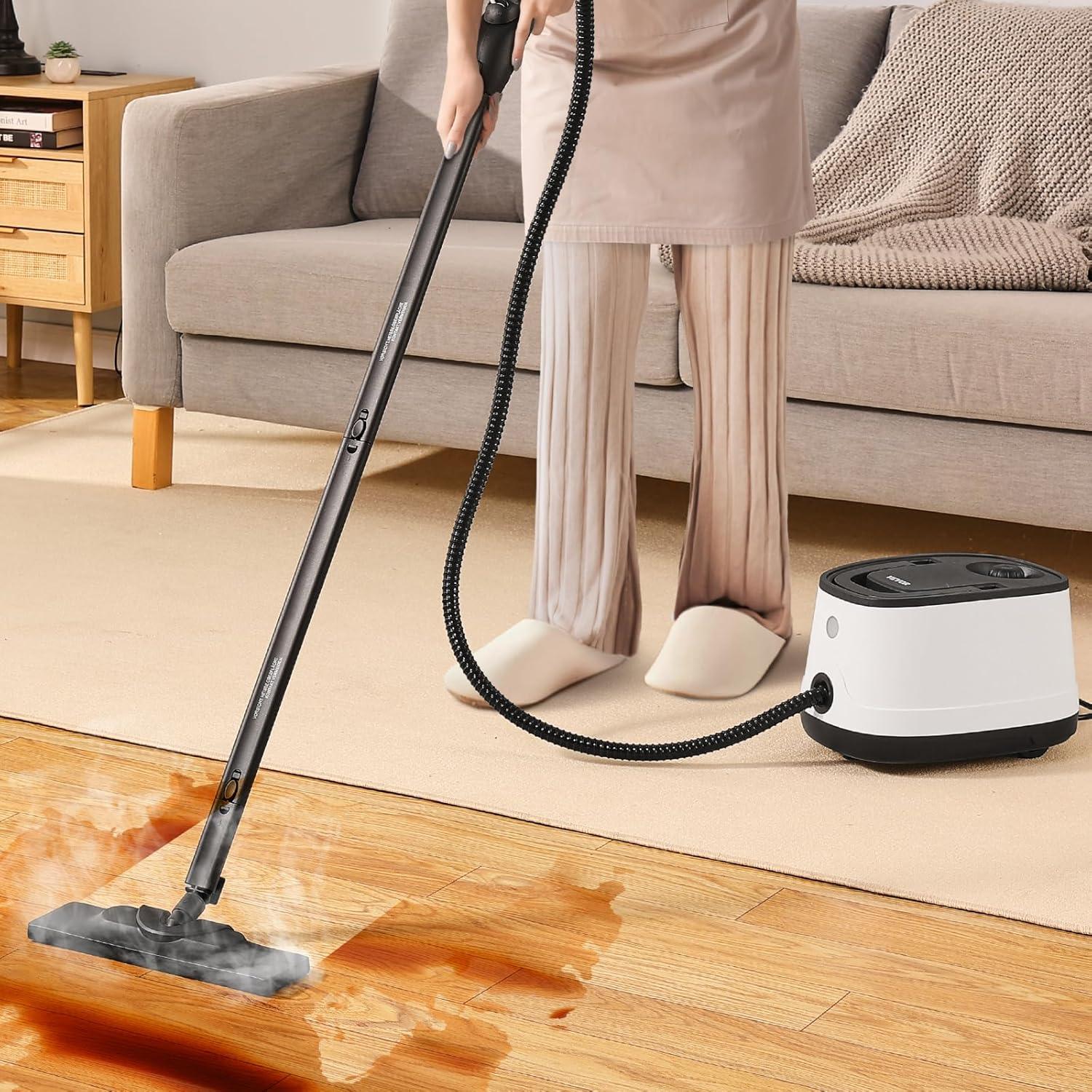 5-Minute Quick Heat-Up: With our intelligent atomization system and 1500W power, this steam cleaner heats up in 5-8 minutes. You can easily adjust the steam flow to clean tiles, marble, wood floors, carpets, and glass. Note: Power may vary by region.