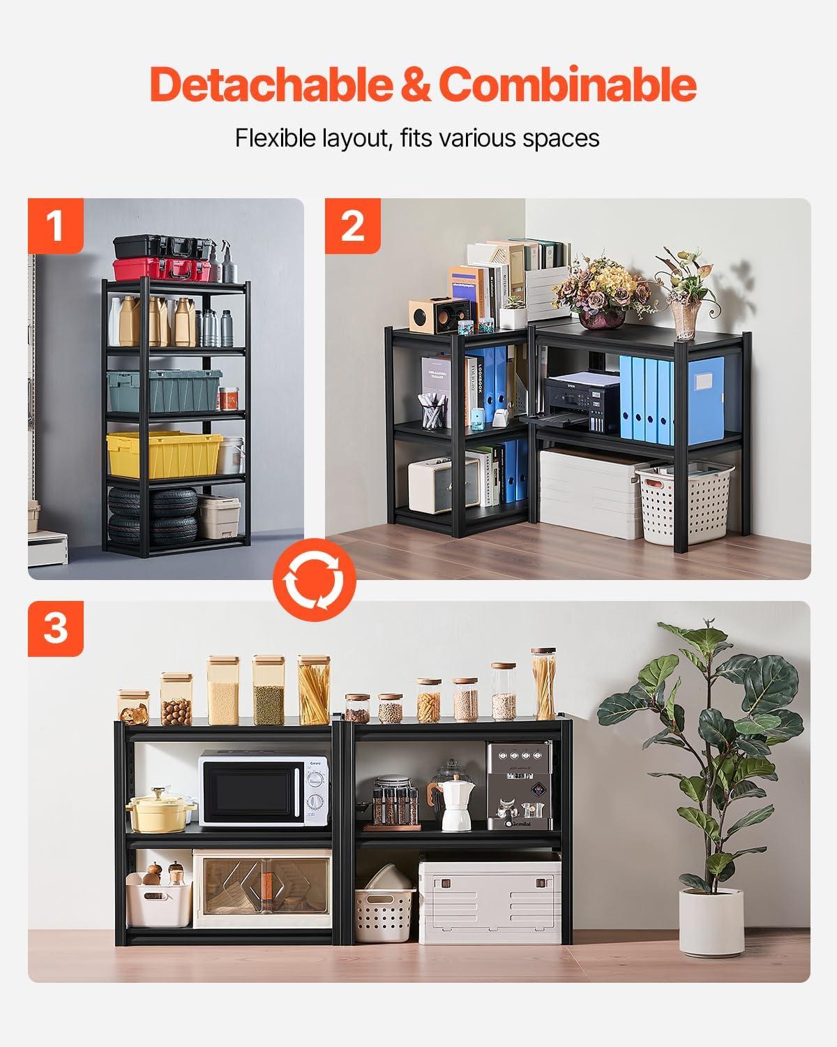 【Adjustable Shelf Height】-Our heavy duty storage shelves are as flexible as your plans. Need to adjust the height? Just slide, decide, and clip it in place. Whether it’s for the garage, kitchen, or pantry, this metal storage rack plays by your rules.