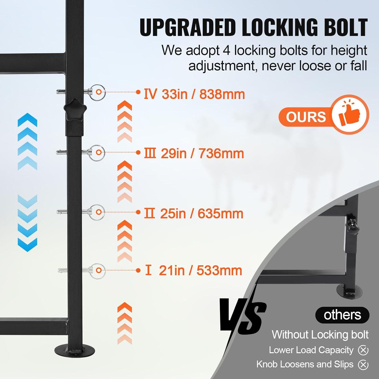 4-Level Adjustable Height: Featuring a unique pin design, our goat stand offers four height settings ranging from 21″ to 33″, accommodating animals of varying sizes. Reinforced uprights with a triangular frame provide added stability and support, enhancing safety.