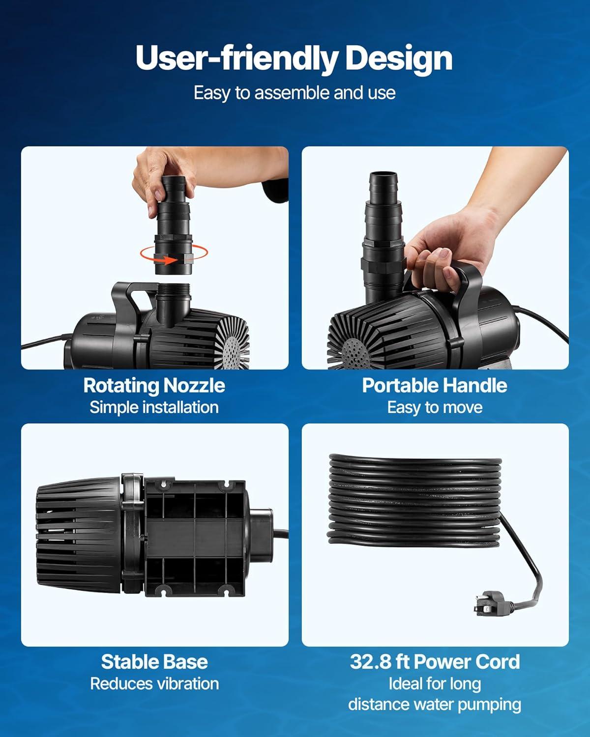 Quick to Clean, Hard to Clog: A removable mesh of the fish pond pump blocks out debris and pops off in seconds for a rinse. You’ll spend less time on cleanup and more time enjoying a steady, reliable flow