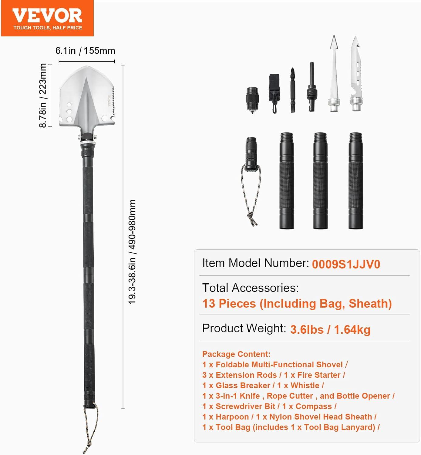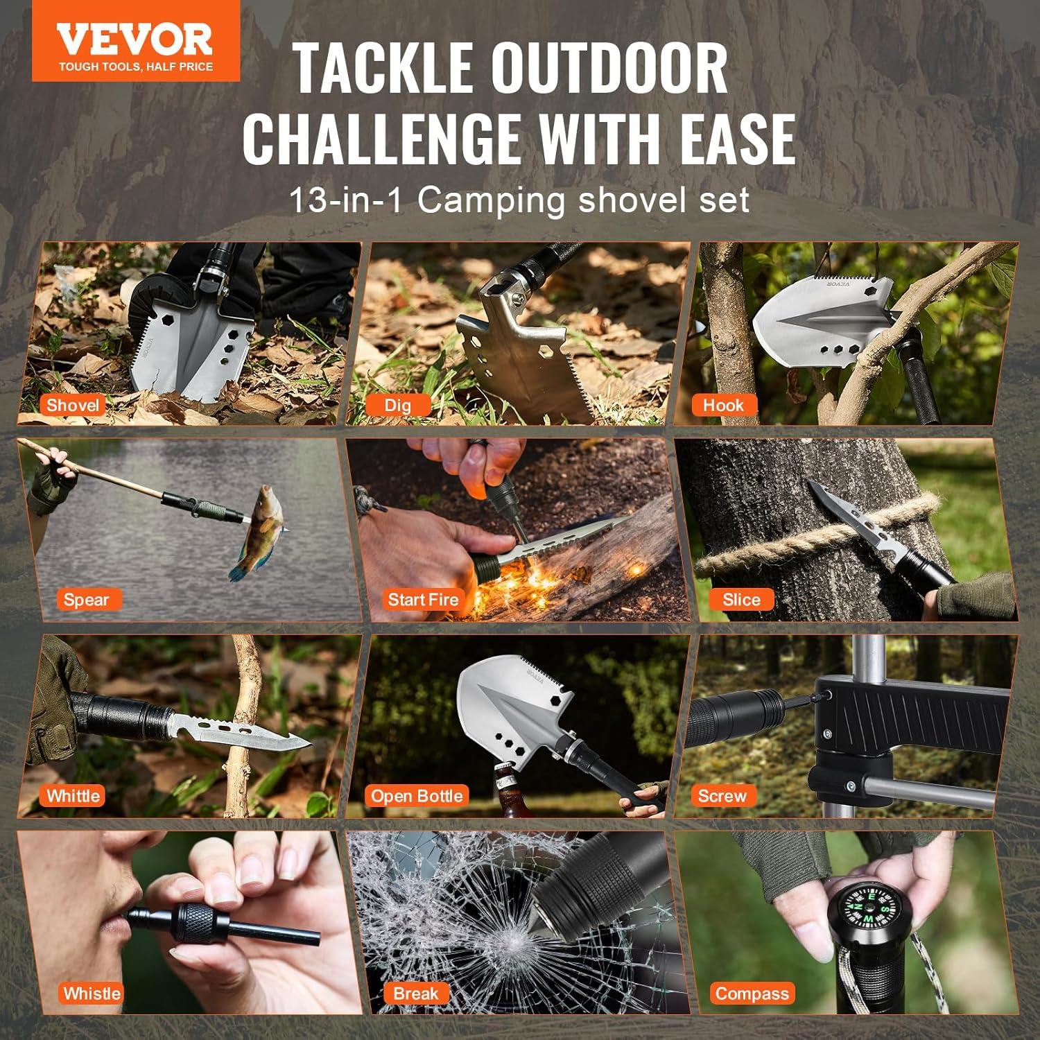 VEVOR Survival Shovel Survival Axe, 28-in-1 Camping Folding Shovels with Hatchet, Stainless Steel Tactical Shovel Hatchet Combo, Multifunctional Emergency Survival Gear Equipment for Camping Hiking(13 in 1)