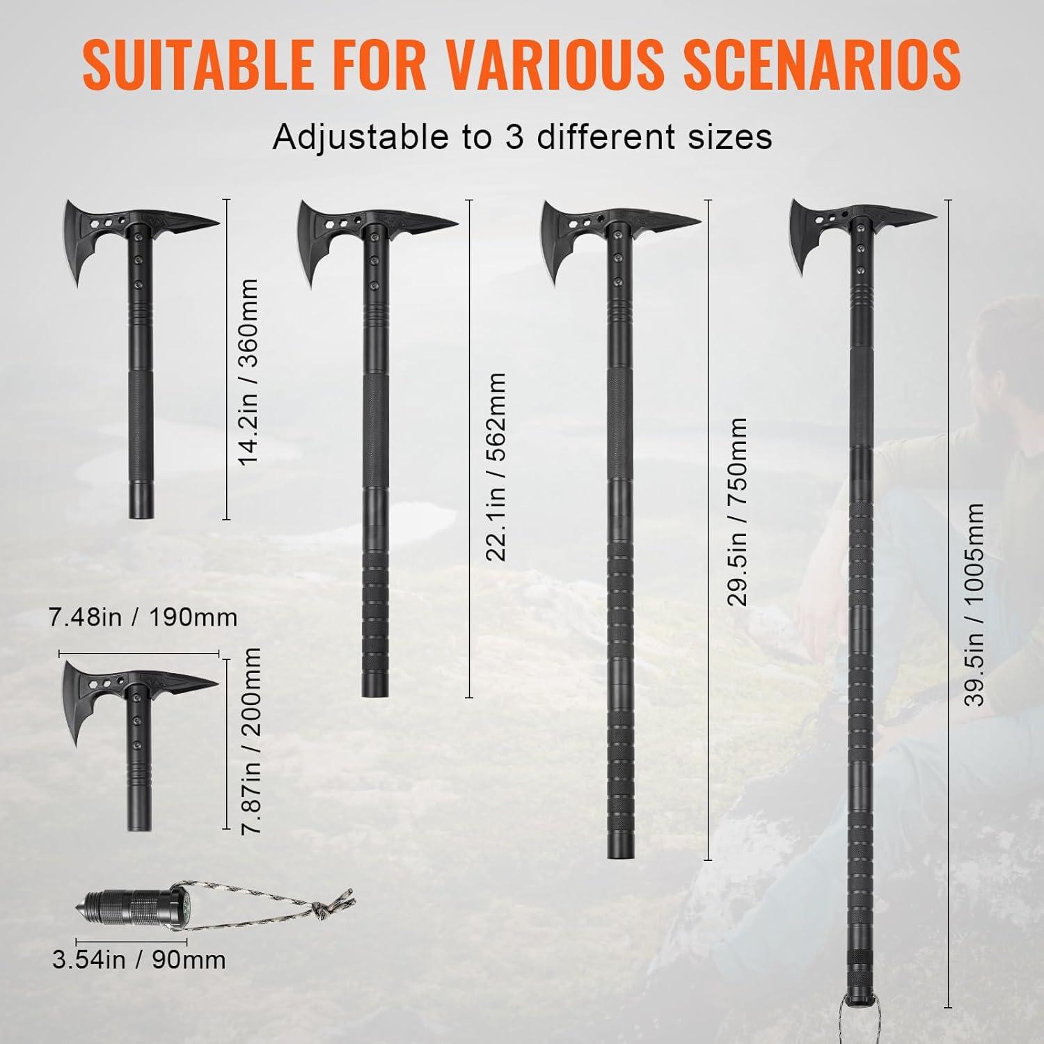 Practical Hatchet: Equipped with a sharp axe blade and an ergonomic design, this survival axe provides excellent striking power and depth. You can use it for chopping wood, clearing branches, or splitting logs. It can be assembled with the extension rod to achieve the desired length.