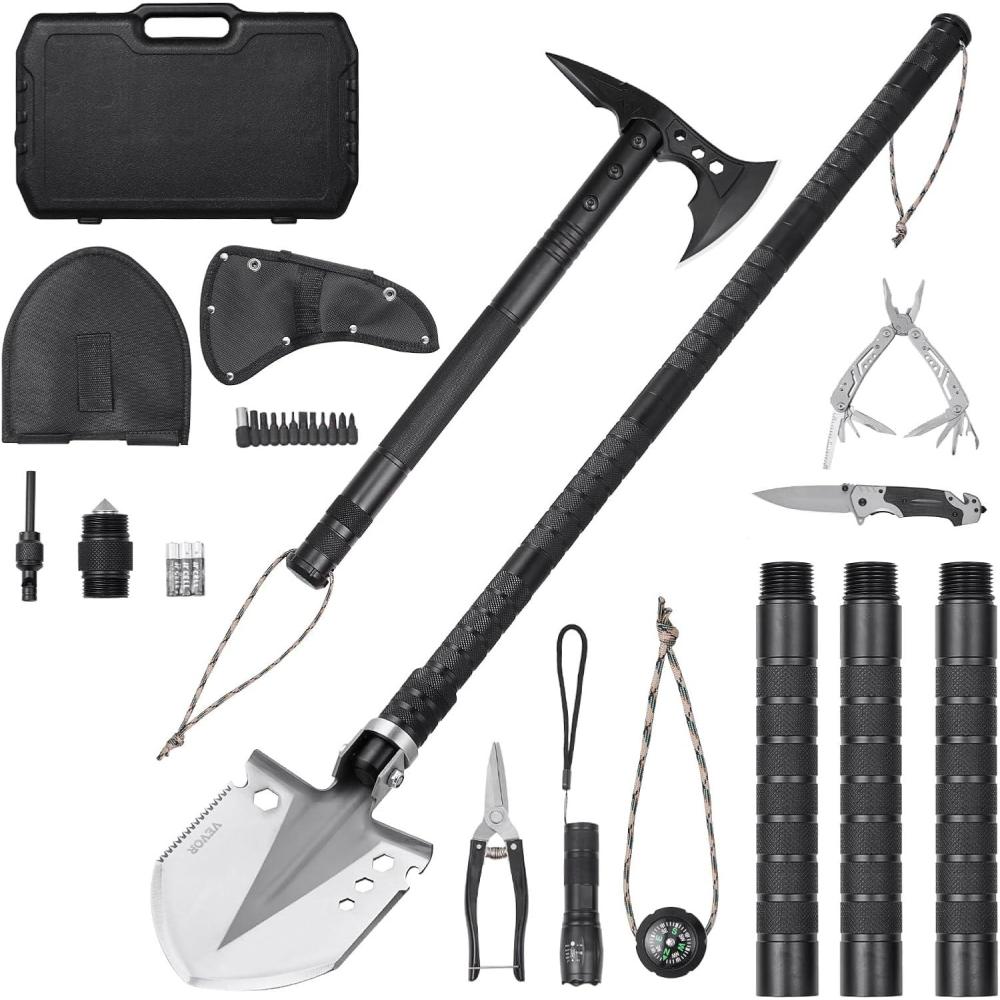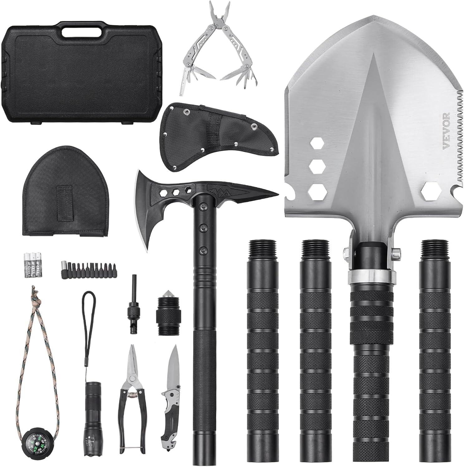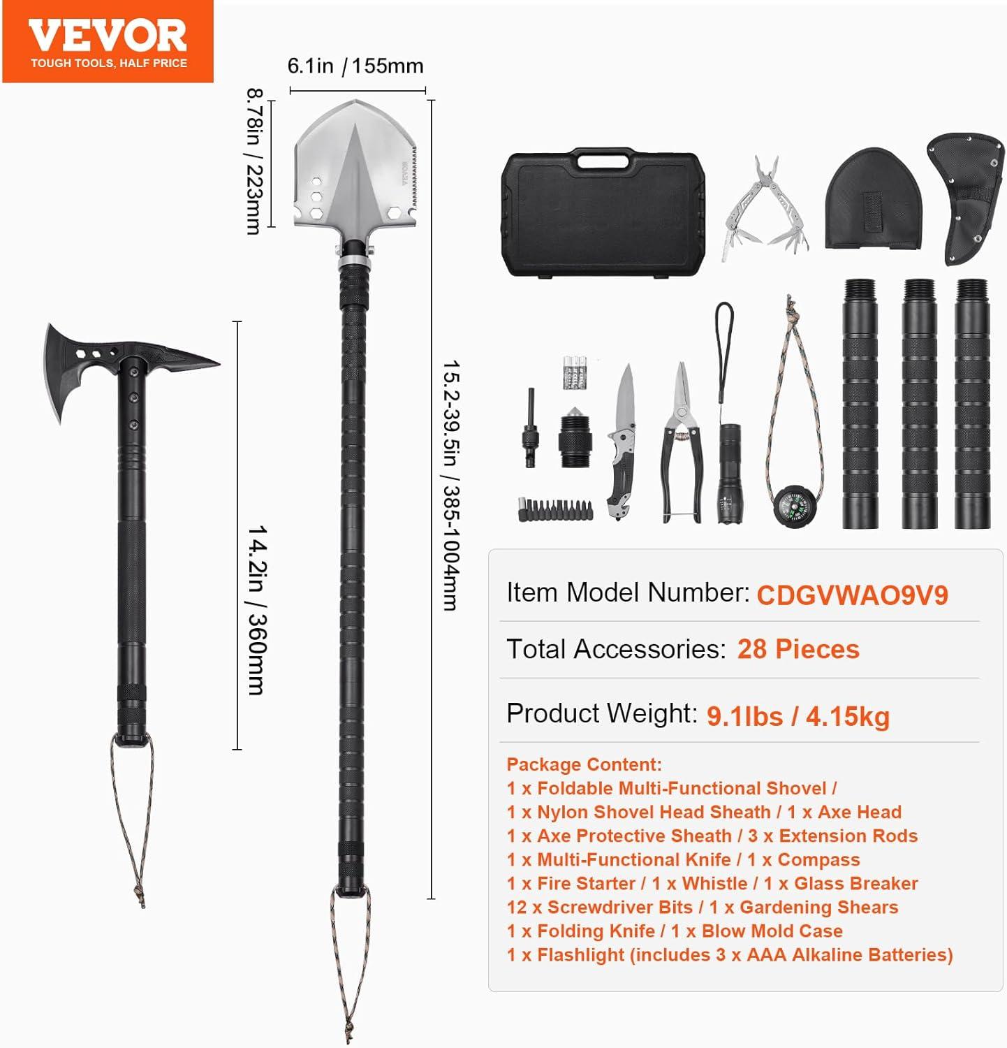 VEVOR Survival Shovel Survival Axe, 28-in-1 Camping Folding Shovels with Hatchet, Stainless Steel Tactical Shovel Hatchet Combo, Multifunctional Emergency Survival Gear Equipment for Camping Hiking(28 in 1)