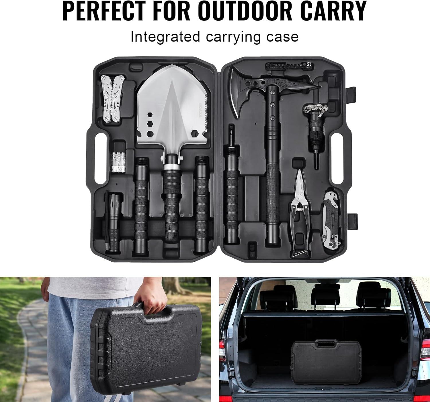 Versatile Camping Multitool Kit: This camping kit includes a shovel, axe, knife, compass, whistle, glass breaker, scissors, flashlight, fire starter, and more. Perfect for digging, chopping, fire-starting, cutting, signaling, and bottle-opening—ideal for outdoor survival, camping, hiking, and wilderness adventures.