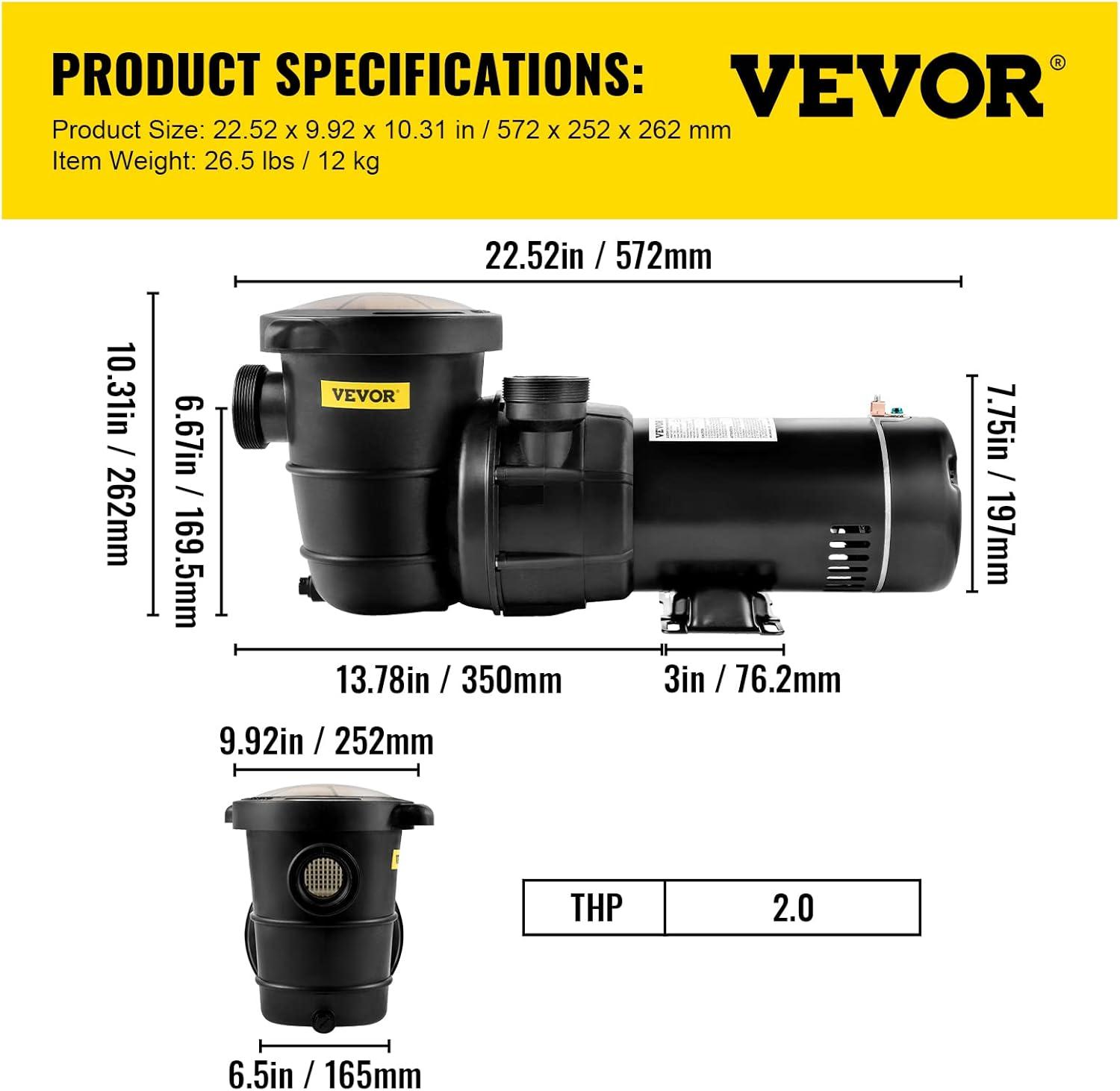 Be the first to review “VEVOR Swimming Pool Pump 1.5HP 115V 1100W, Single Speed Pumps for Above Ground, Powerful Pool Pumps with Strainer Filter Basket, 5280 GPH Max. Flow, Certification of ETL for Security(Single Speed)”