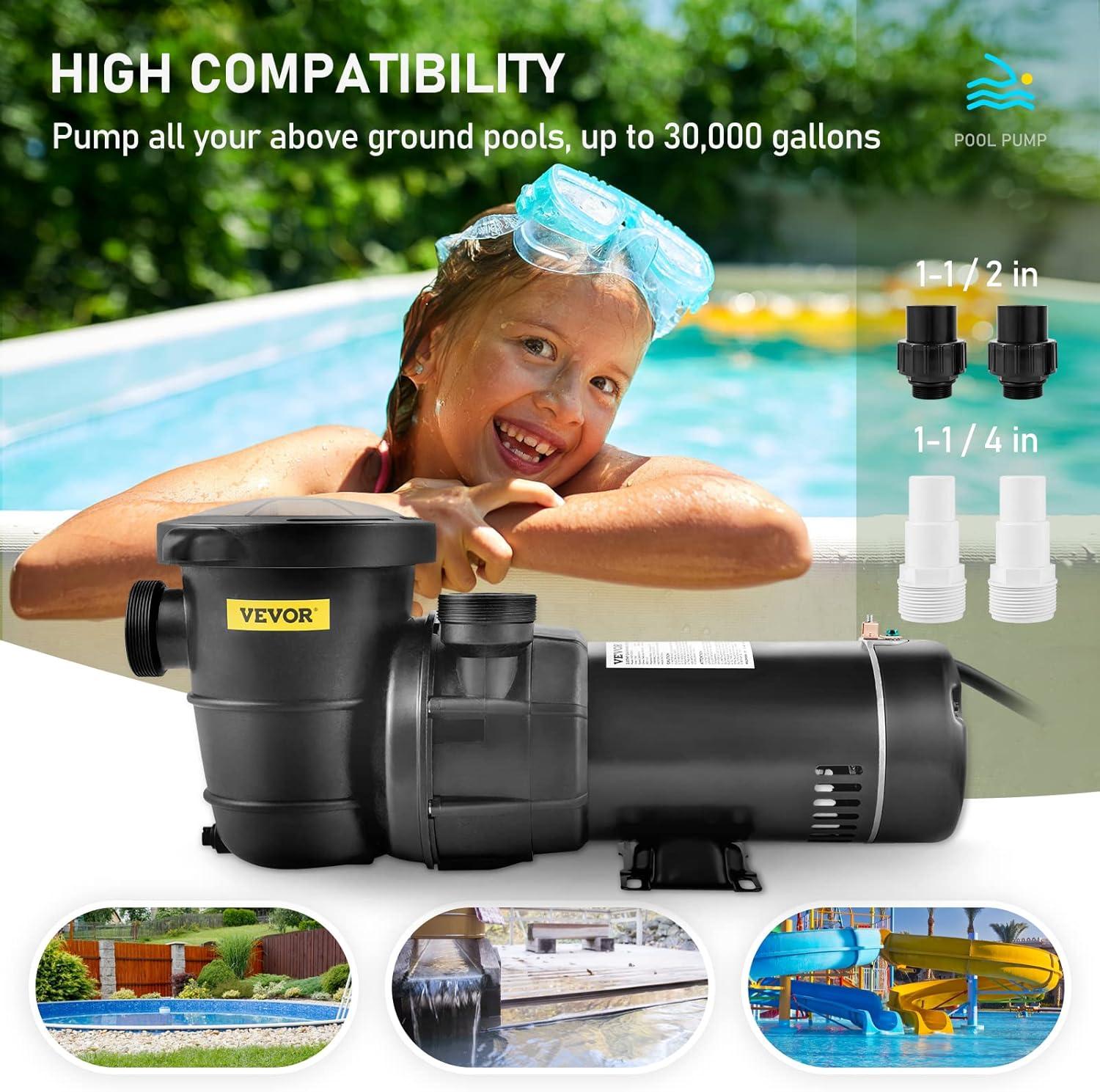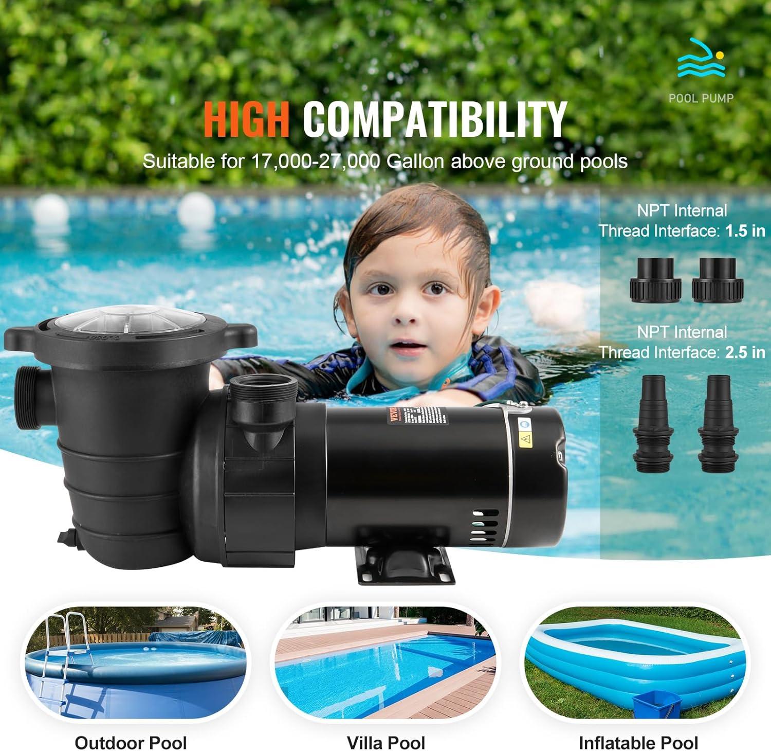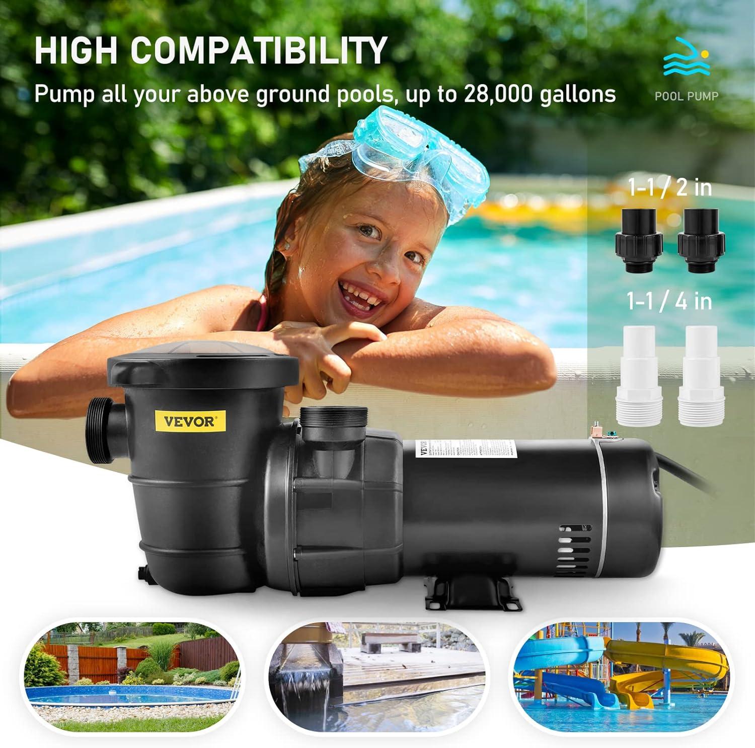 Fit for Above Ground Pool: The swimming pool pump is ideal for max. 28000 gallons of hot tubs, thermal springs(including salty pools), and irrigation systems. 2 of 1-1/2'' and 2 of 1-1/4'' NPT interfaces are included for compatibility with your different sized hoses. It will effortlessly provide you with a clean swimming experience every time. Stop worrying about dirt or other disgusting substances coming into your pool.