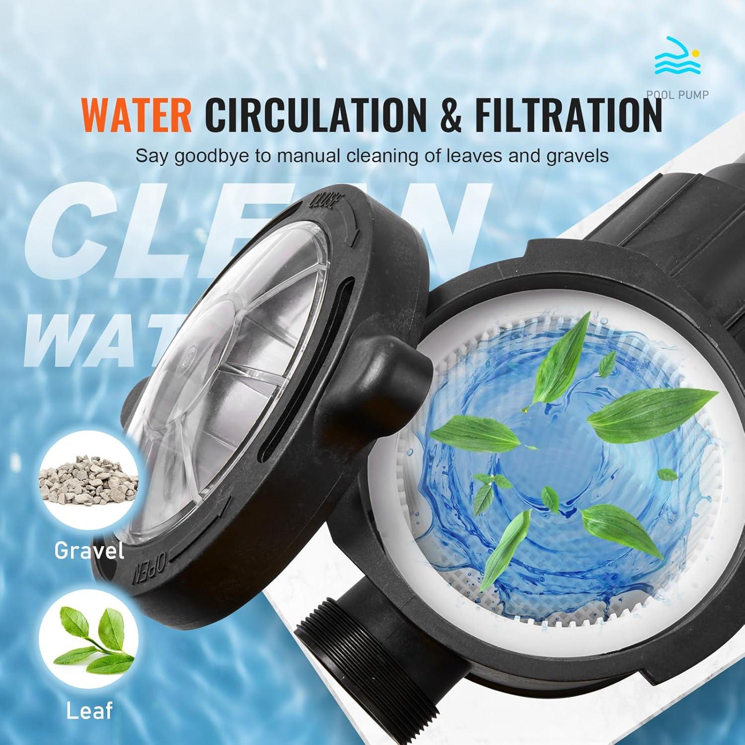 Stable Flow & Timely Cleanup: The continuous water flow rate of 88 GPM lifts to a 43 ft height for fast water circulation. The detachable filter basket works with a 19'' sand filter (not included) to achieve physical purification functions, keeping your pool water clear. The PVC lid lets you see exactly when the basket needs cleaning. Never see your pool dirty again, and get ready to see the bottom of your pool every time.