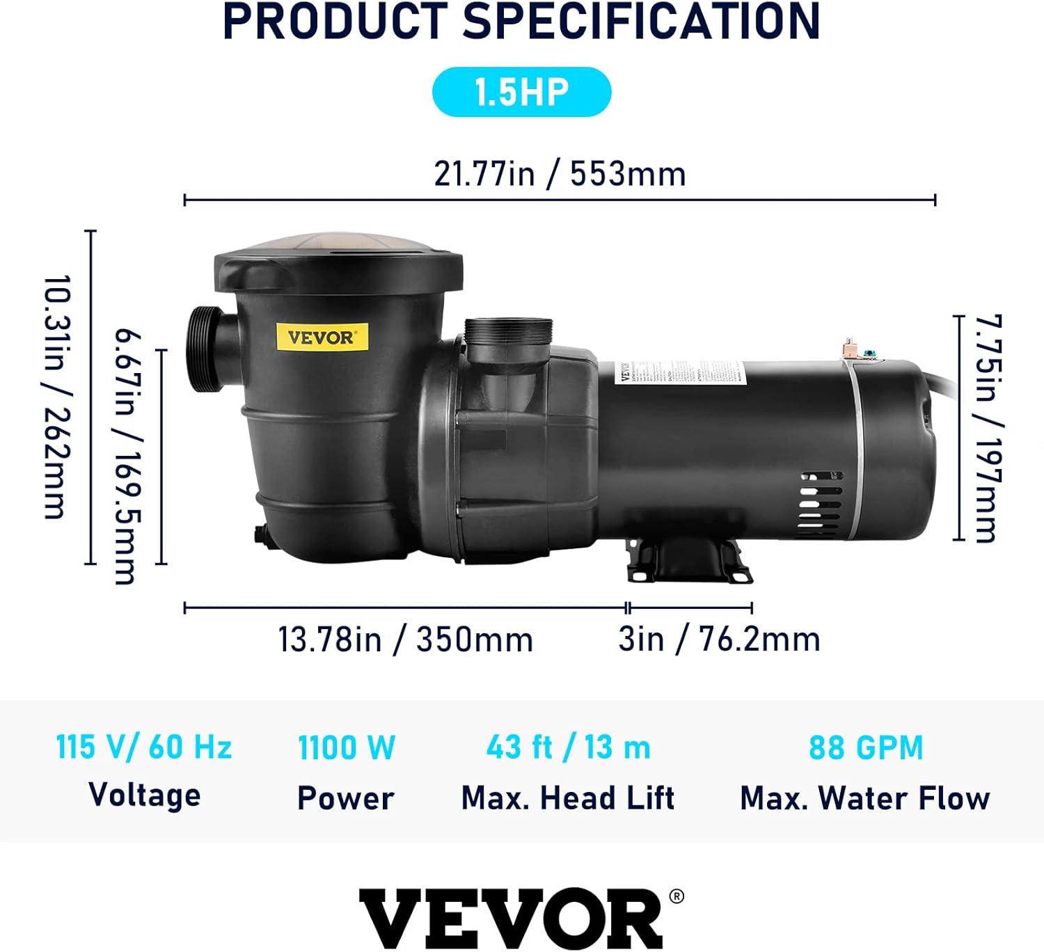 VEVOR Swimming Pool Pump 1.5HP 115V 1100W, Single Speed Pumps for Above Ground, Powerful Pool Pumps with Strainer Filter Basket, 5280 GPH Max. Flow, Certification of ETL for Security(Dual Voltage)