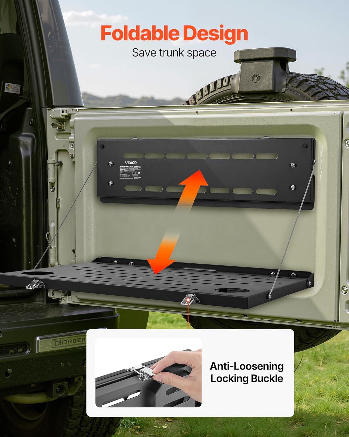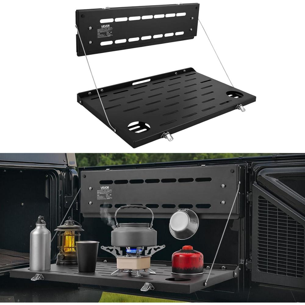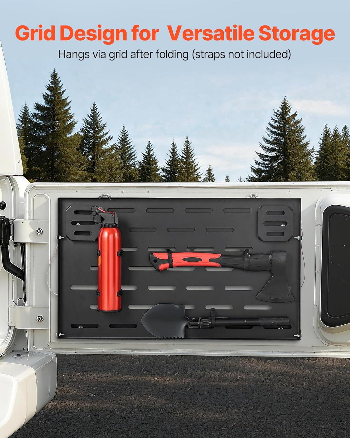 Multi-Purpose Storage: This rear door foldable table ensures a spacious tabletop for work, cooking, or picnic needs. When folded, the versatile mesh panel allows you to hang bags, tools, and fire extinguishers, enhancing vehicle storage efficiency