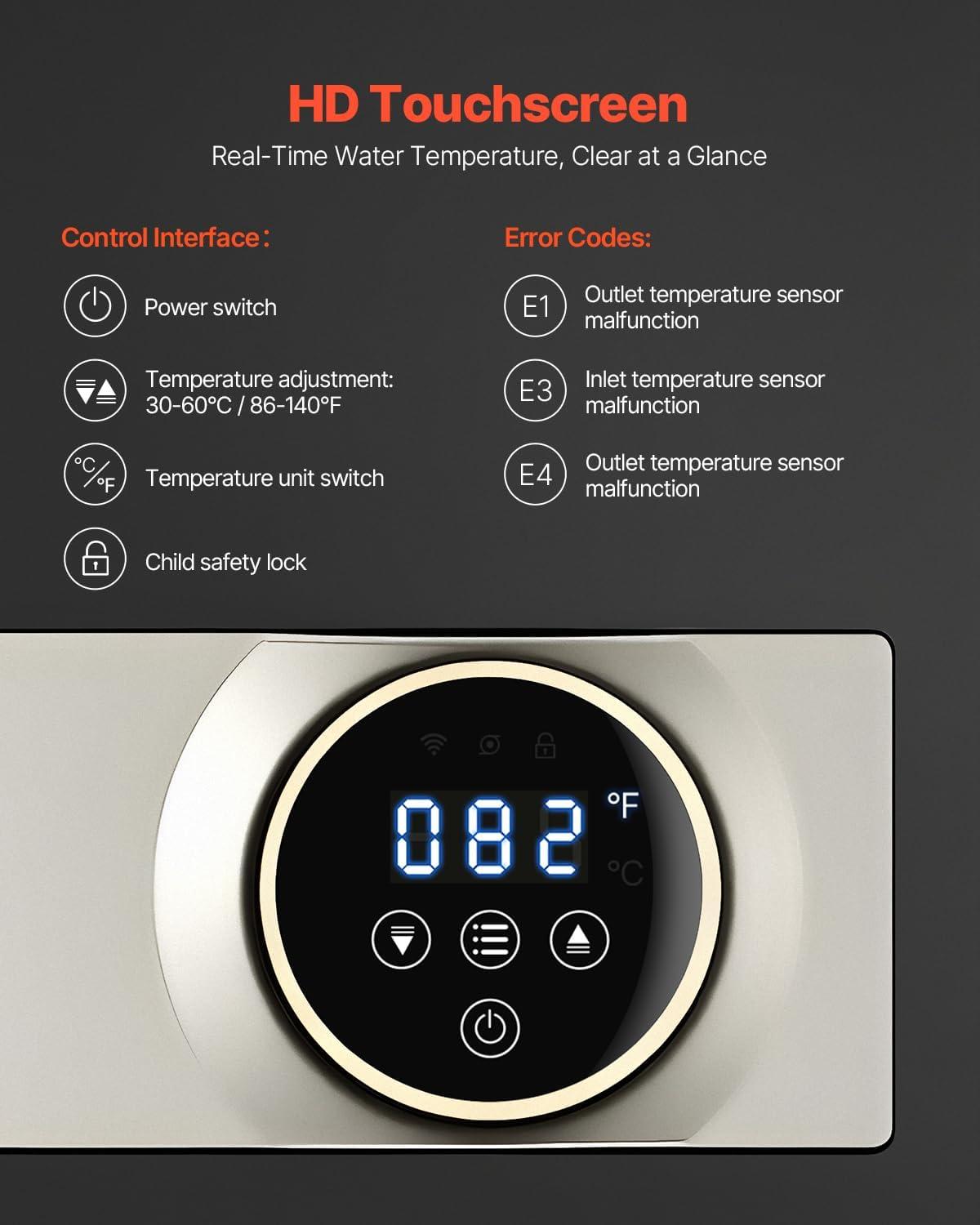 With Security Lock: The tankless electric water heater comes with a security lock that can be triggered with a long press. The touch screen allows you to monitor water temperature and other heating functions in real time, making it easy for everyone, including elderly users, to operate