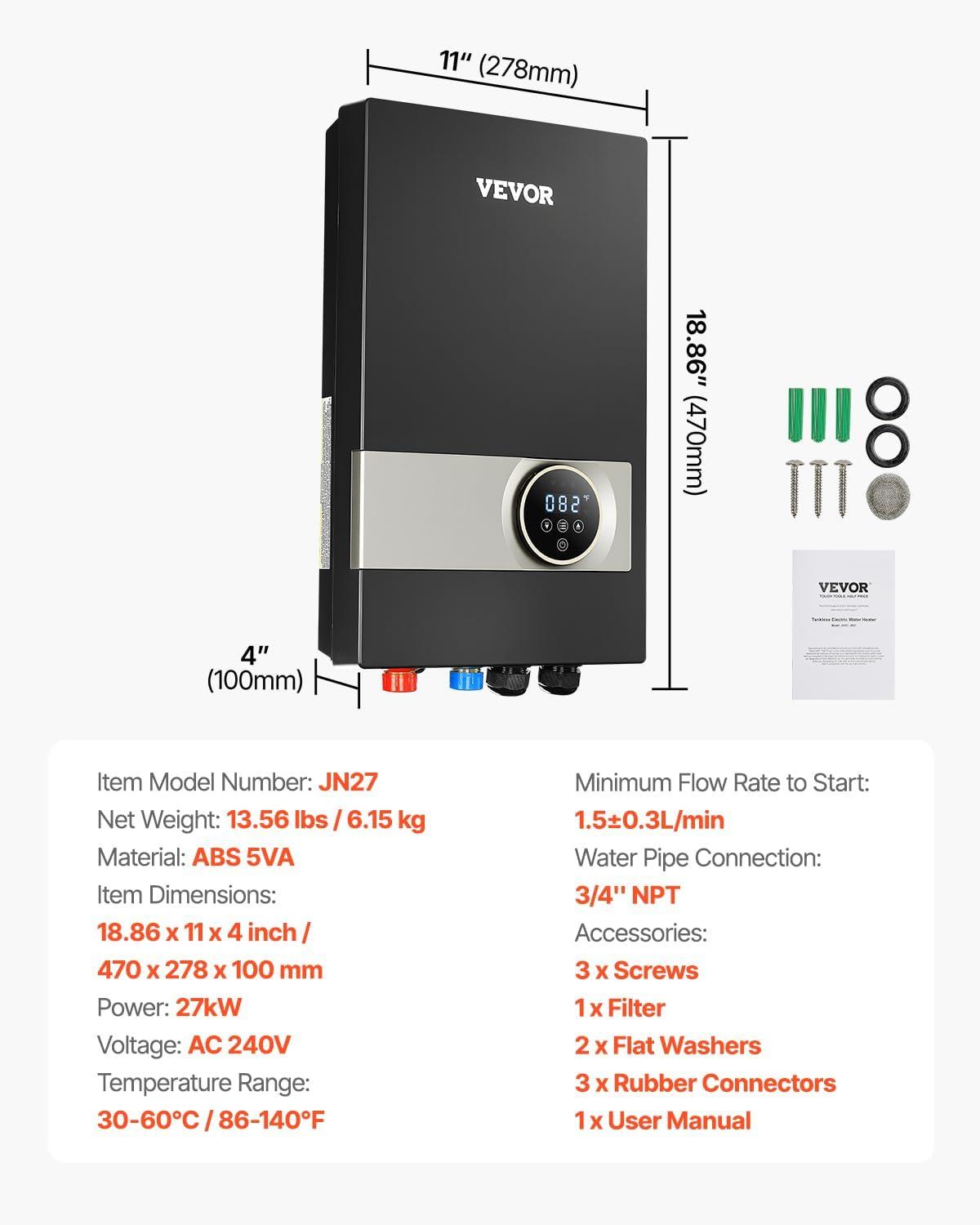 VEVOR Tankless Electric Water Heater, 27kW Instant Hot Water Heater Under Sink, On Demand for Bathroom, Kitchen, Office with LCD Touch Screen, Child Security Lock,Space-Saving, 240V Black(27KW)