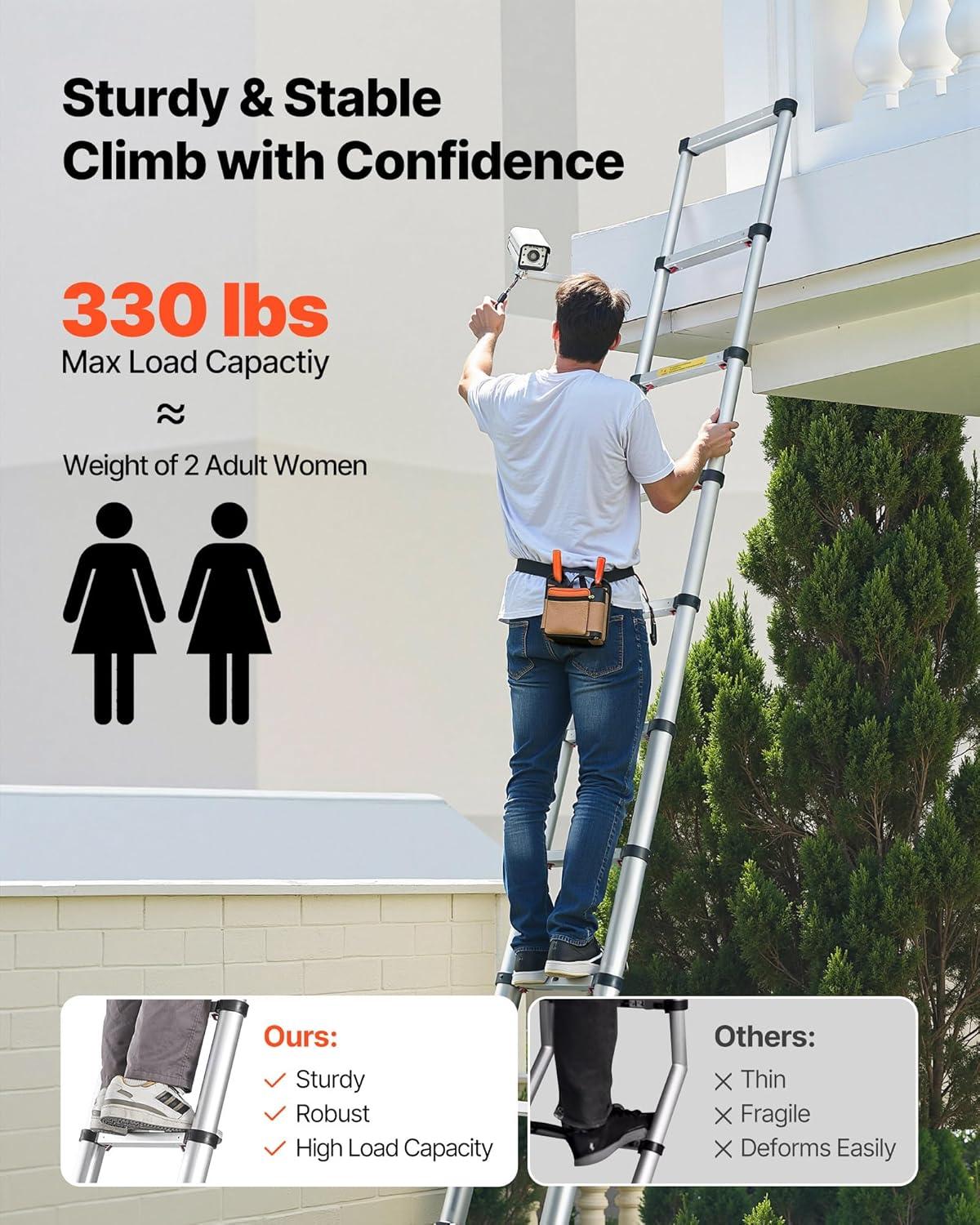 Stable and Durable: Made from robust aluminum with nylon connectors for enhanced durability, this ladder supports up to 375 lbs, meeting various home and commercial needs and providing peace of mind during elevated tasks.