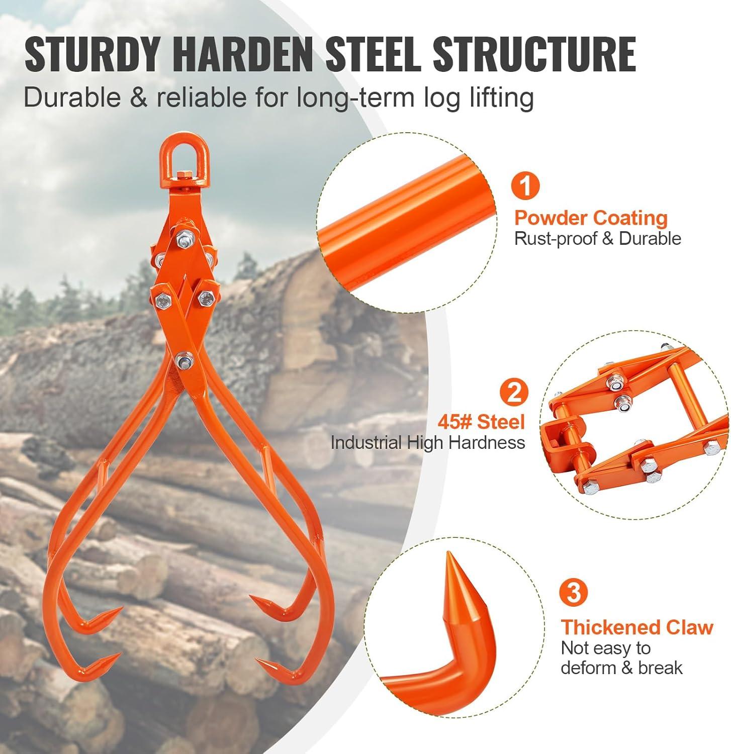 Strong Load Capacity: Made from reinforced #45 steel, this log grapple supports up to 2205 lbs, with no risk of hook bending or breakage even after prolonged use. The surface is spray-coated for rust resistance and wear durability, ensuring it remains intact even when dragged along the ground