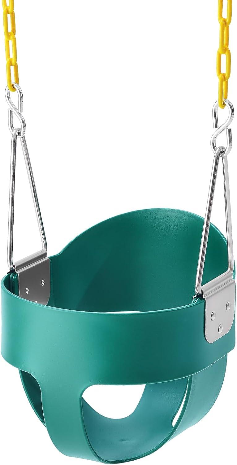 150 lbs High Load Capacity: The VEVOR heavy duty high back full bucket toddler swing supports a maximum weight of 150 lbs (68 kg), accommodating older children for extended use. It includes heavy-duty chains, a full bucket seat, and snap hooks to ensure safe play.
