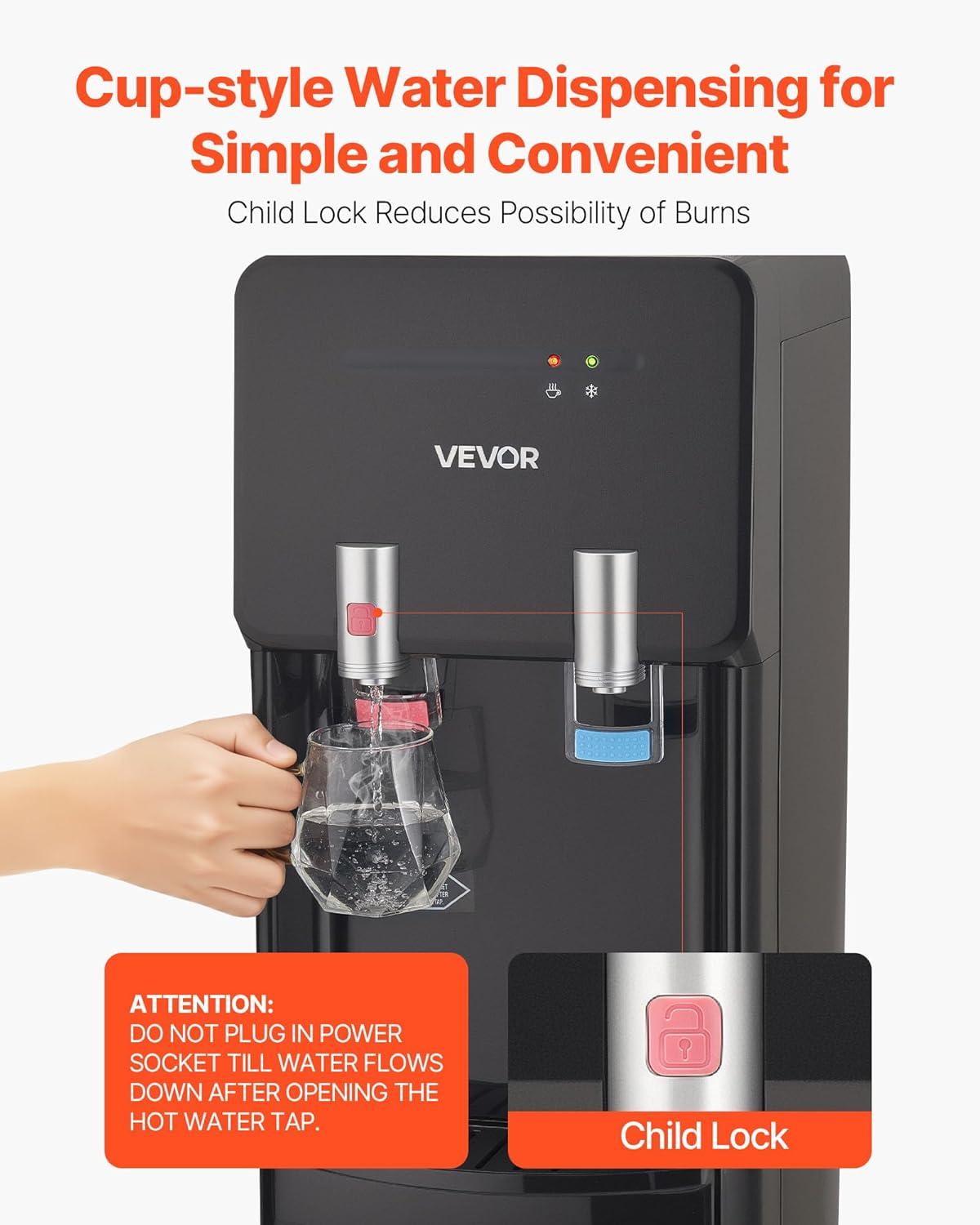 Efficient Hot & Cold Water Supply: This water dispenser features advanced compression refrigeration and internal heating technology, providing hot water up to 187℉ and cold water as low as 50℉. The dual water outlets allow you to fill both sides simultaneously