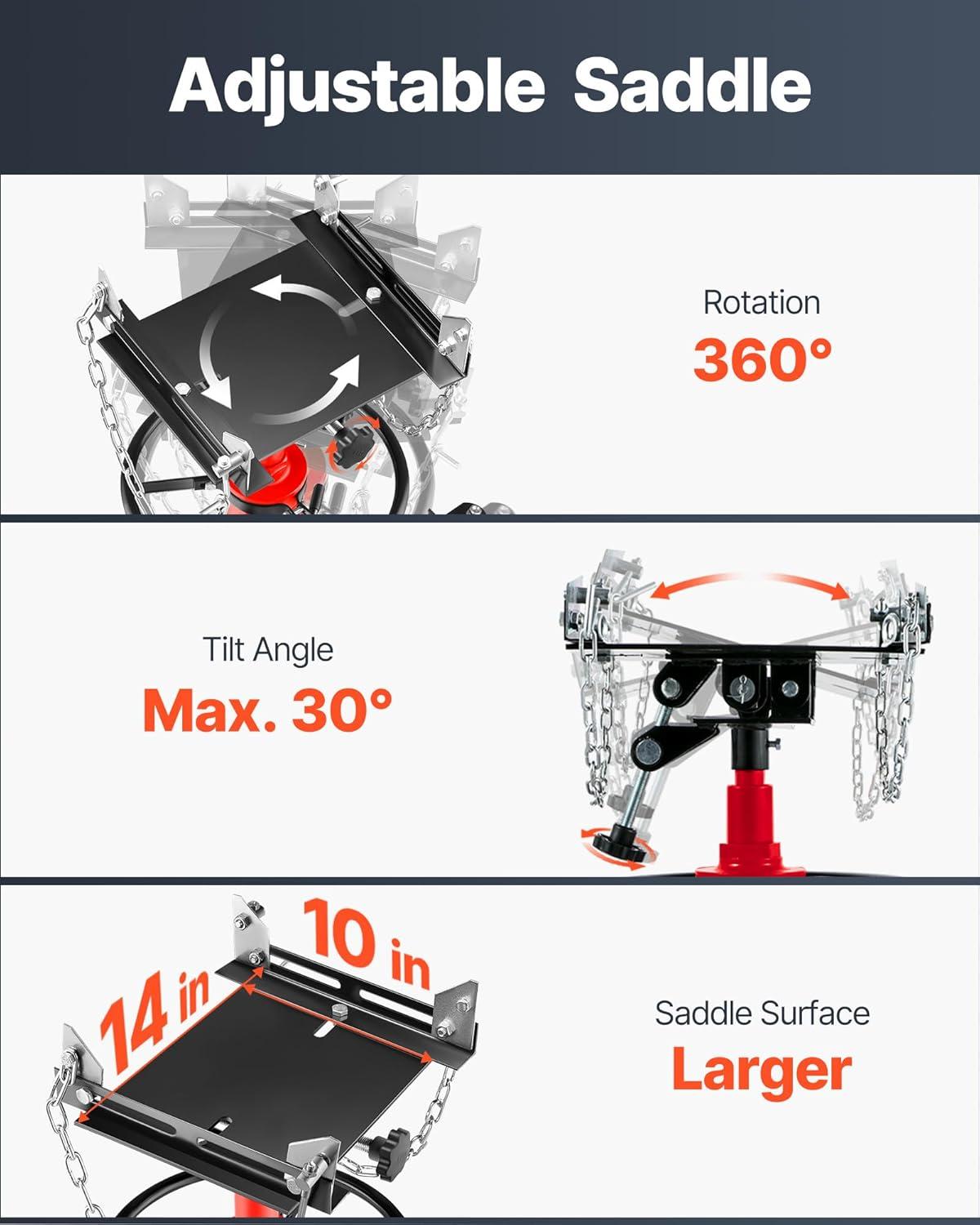 33-1/2″ -67″ Lifting Range: Enhanced hydraulic pressure for an extended lifting range, the pedestal transmission jack with a 33-1/2 inch to 67 inch lift range, our jack can lift your car to any suitable height. Comes with a foot-operated pedal, so it's easier to rise, and free up your hands.