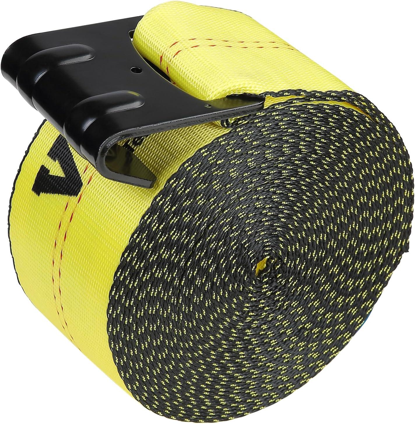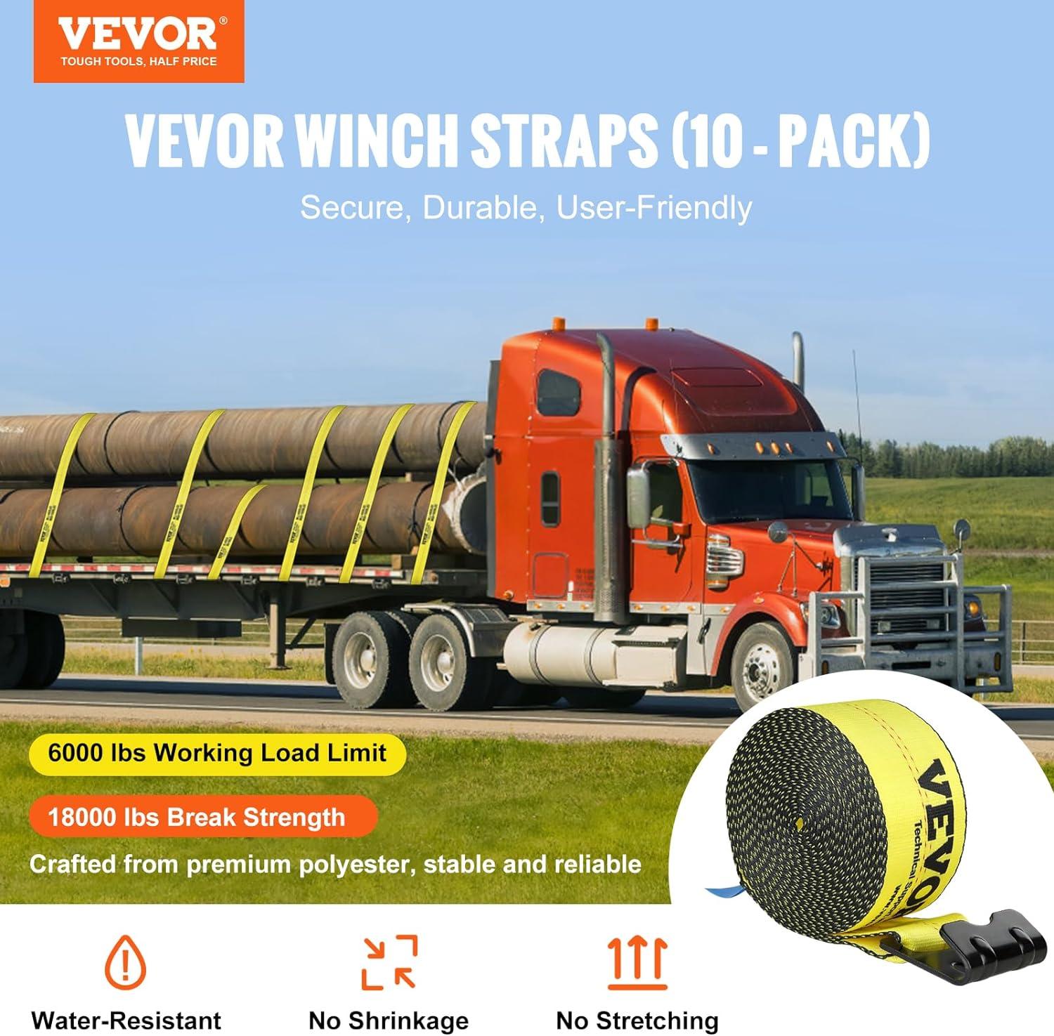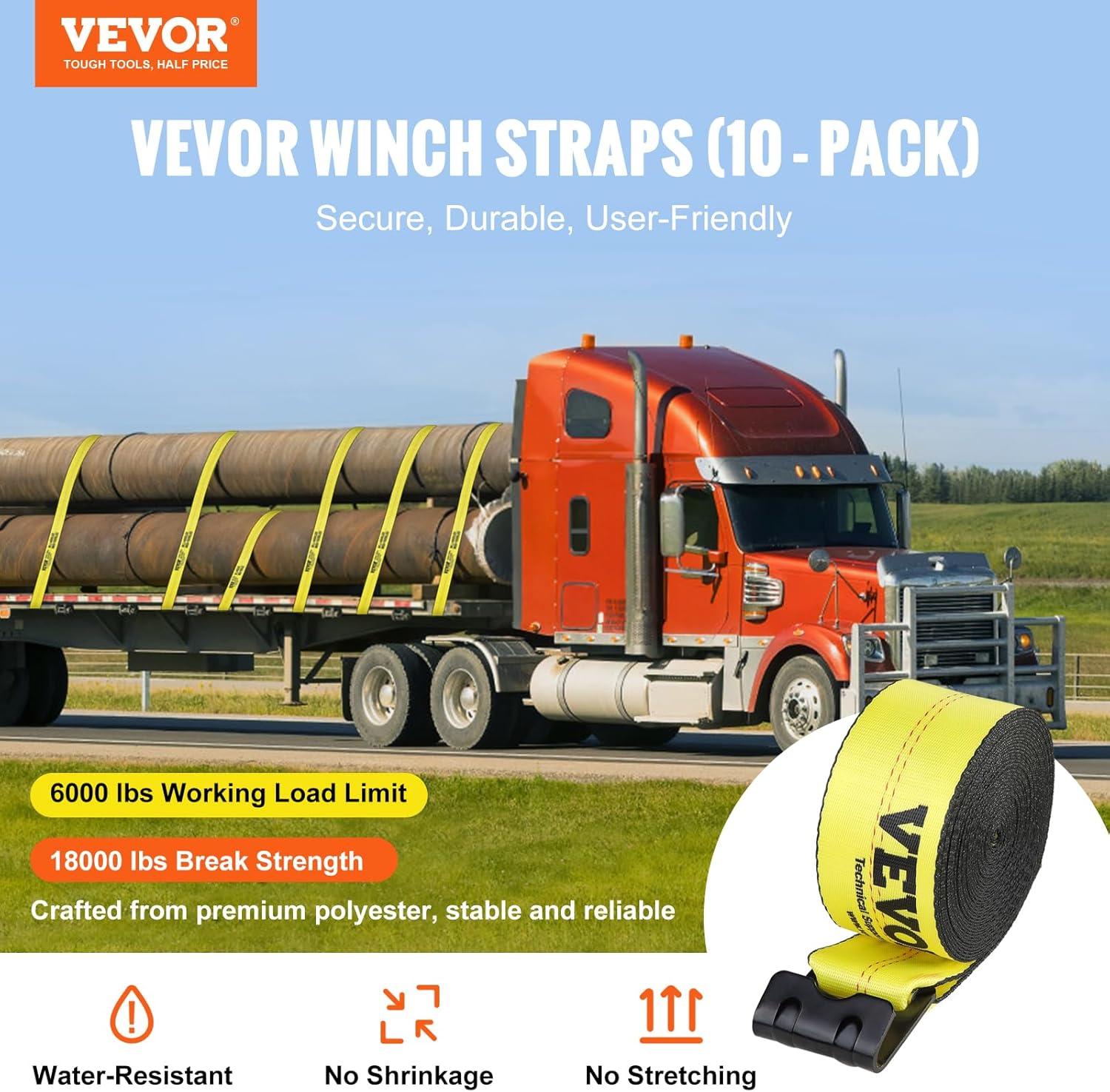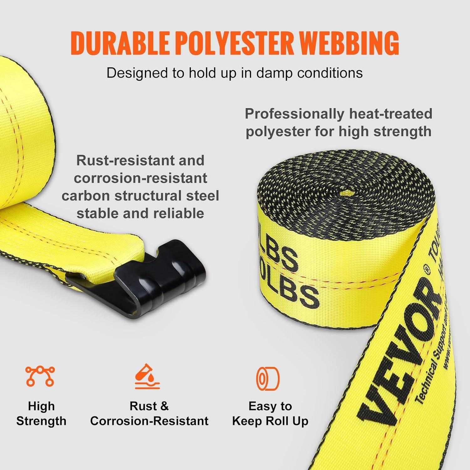 VEVOR Truck Straps, 4″ x30′ Heavy Duty Tie Down w/Flat Hooks 18,000lbs Break Strength, WLL# 6000lbs, Cargo Straps tie Down for Flatbeds, Trucks, Trailers, Farms, Rescues, Tree Saver, Yellow(10 Pack)(Yellow)