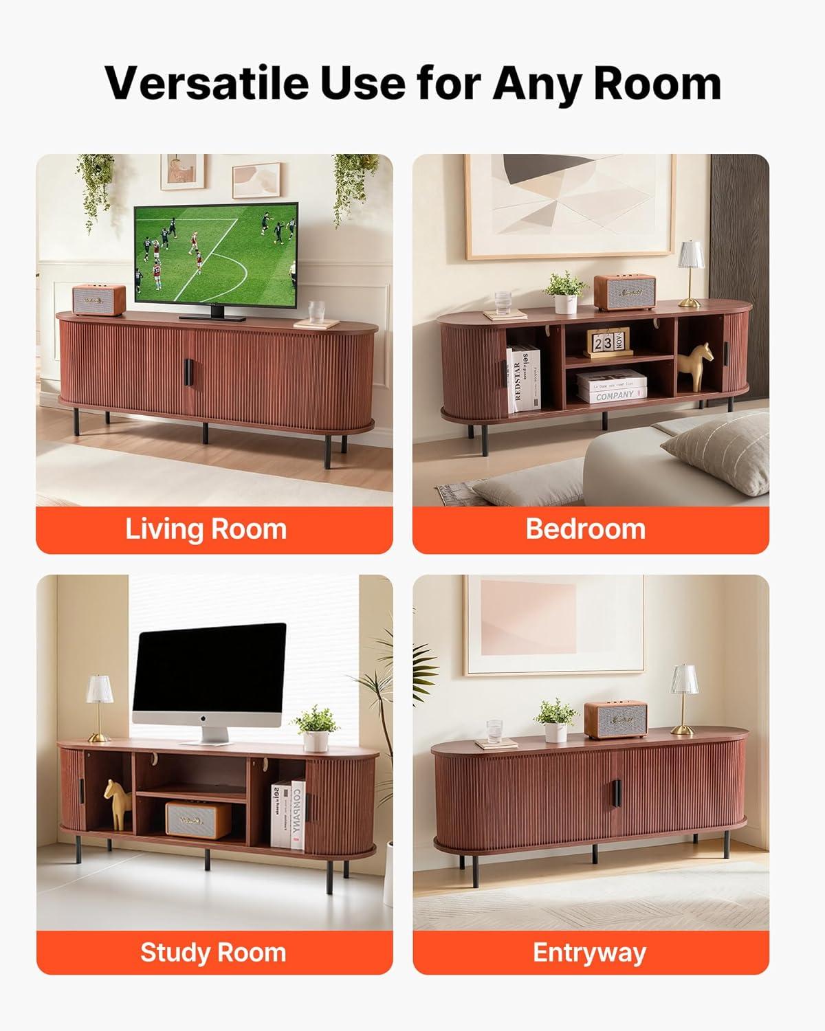 imageVEVOR TV Stand for TVs up to 65 inch MidCentury Modern Entertainment Center Media Console Table with Storage Cabinet and Sliding Tambour Door Boho Television Stand for Living Room Bedroom OakBrown