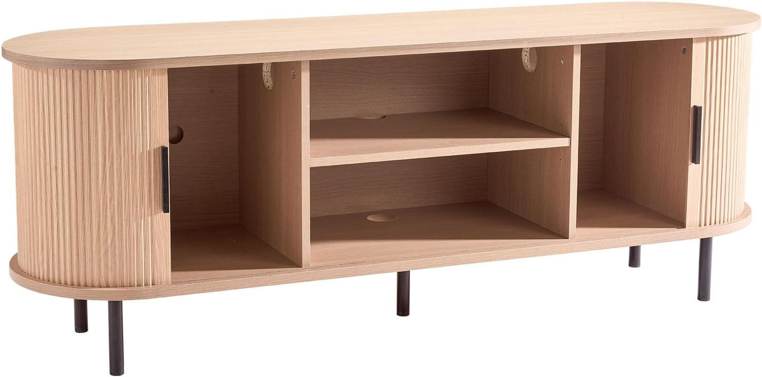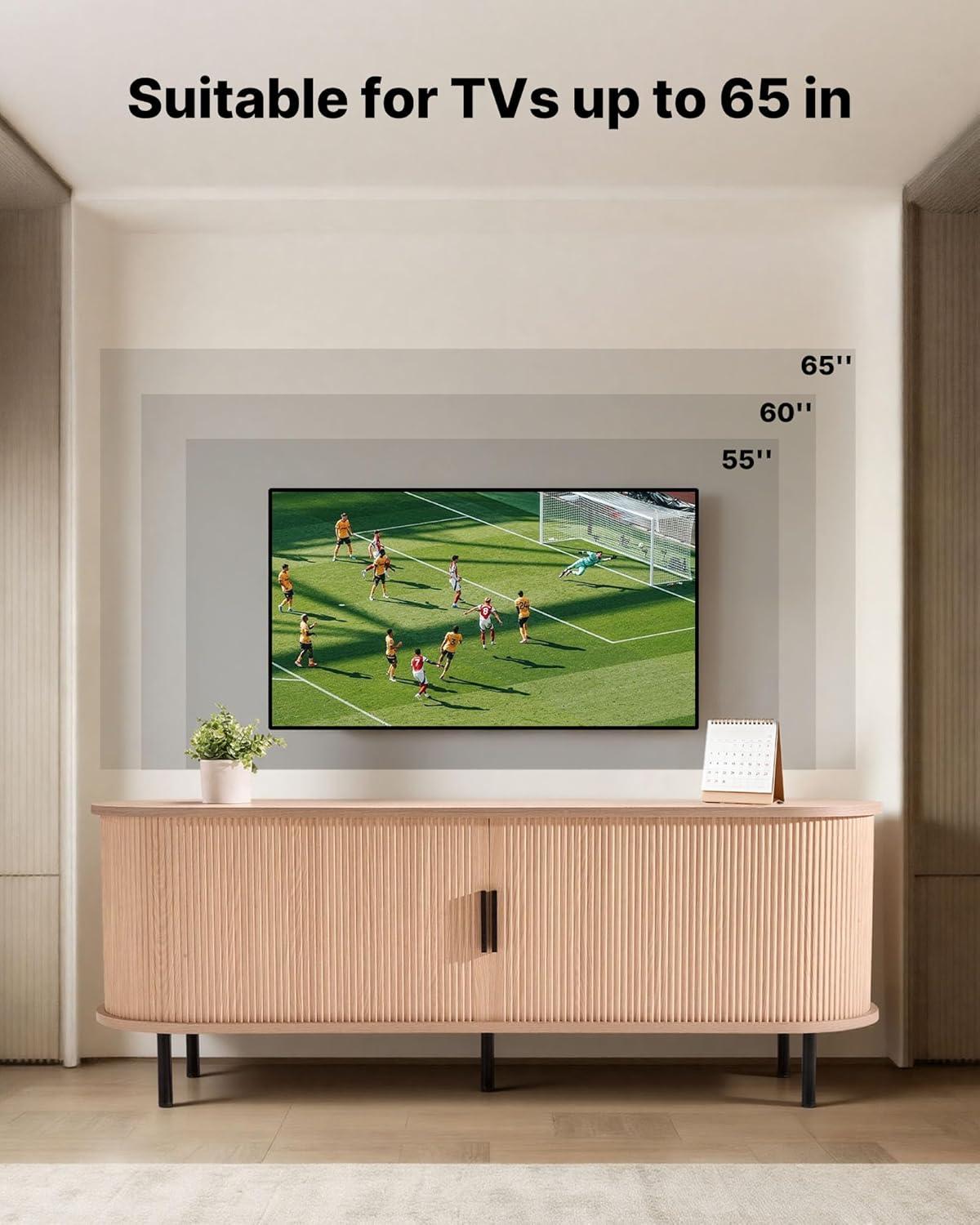 Fits Up to 65 in TVs: This bohemian-style TV stand is designed for 55–65 in TVs. Featuring natural wood color with a slatted door frame design, it is suitable for living rooms, bedrooms, and home offices, making your space fashionable