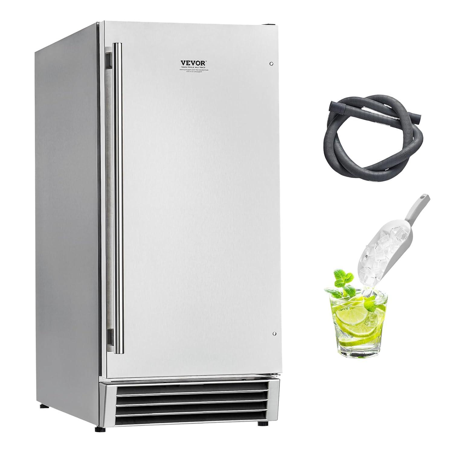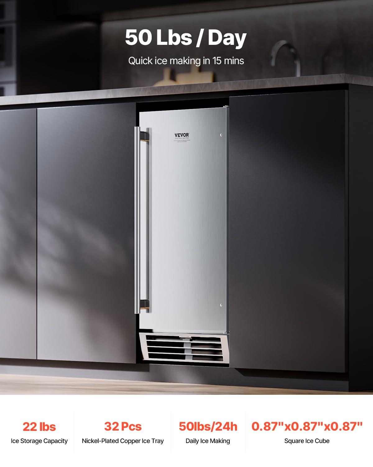VEVOR Under Counter Ice Maker Machine, Crescent Ice, 25 Lbs/Day Stainless Steel Built in Ice Maker with Reversible Door, 22Lbs Storage Ice Maker Machine for Commercial Home Kitchen, No Drain Required(Cube Ice Outdoor)