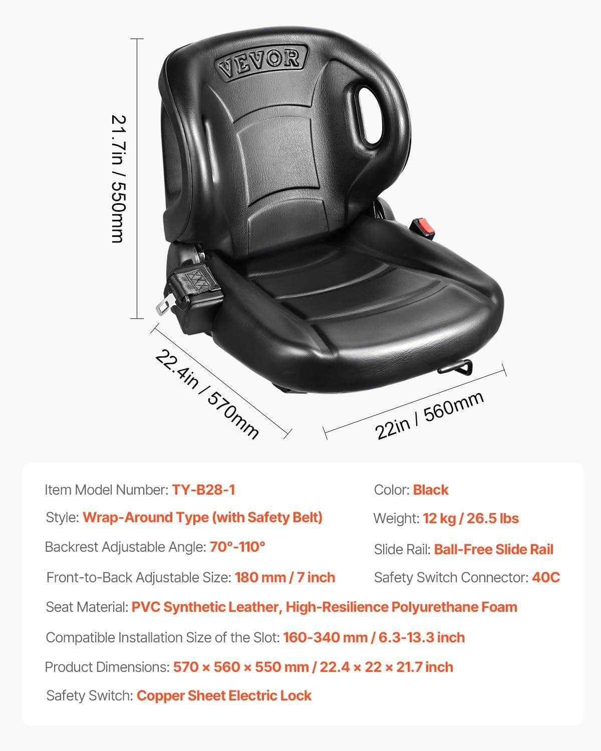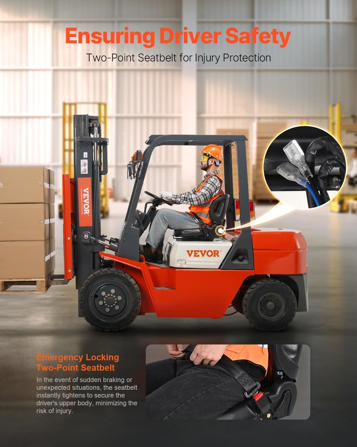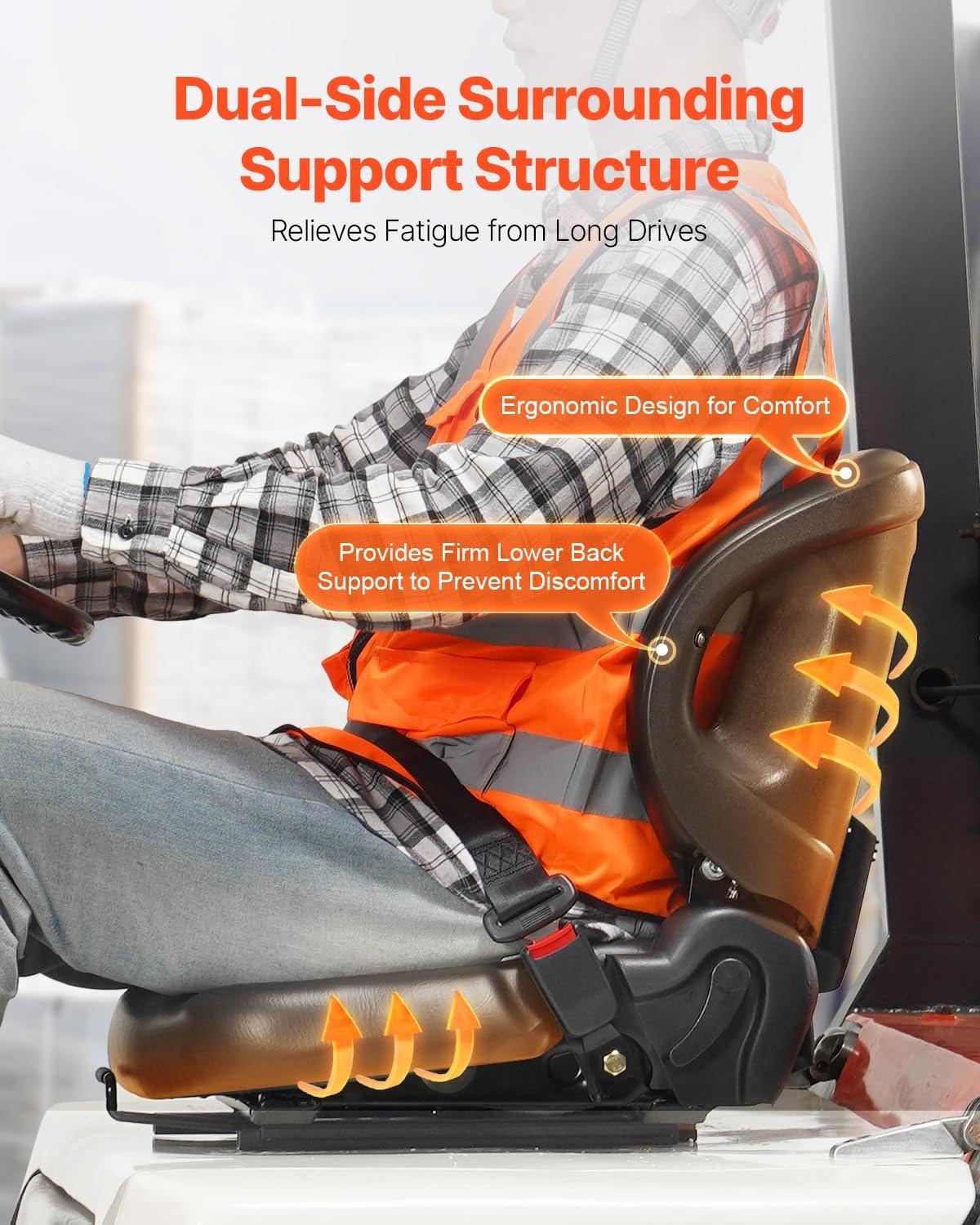 Enhanced Security: Equipped with a gravity-sensing micro-switch, the seat ensures the forklift only operates when the driver is seated, ensuring security. The emergency locking seatbelt provides crucial protection in case of an accident, reducing the risk of injury.