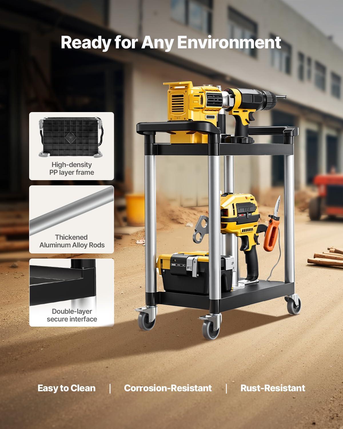 Stable and Durable: Made from industrial-grade PP and an aluminum alloy frame, this utility service cart is waterproof, rust-resistant, and sturdy, handling heavy loads for both indoor and outdoor use.
