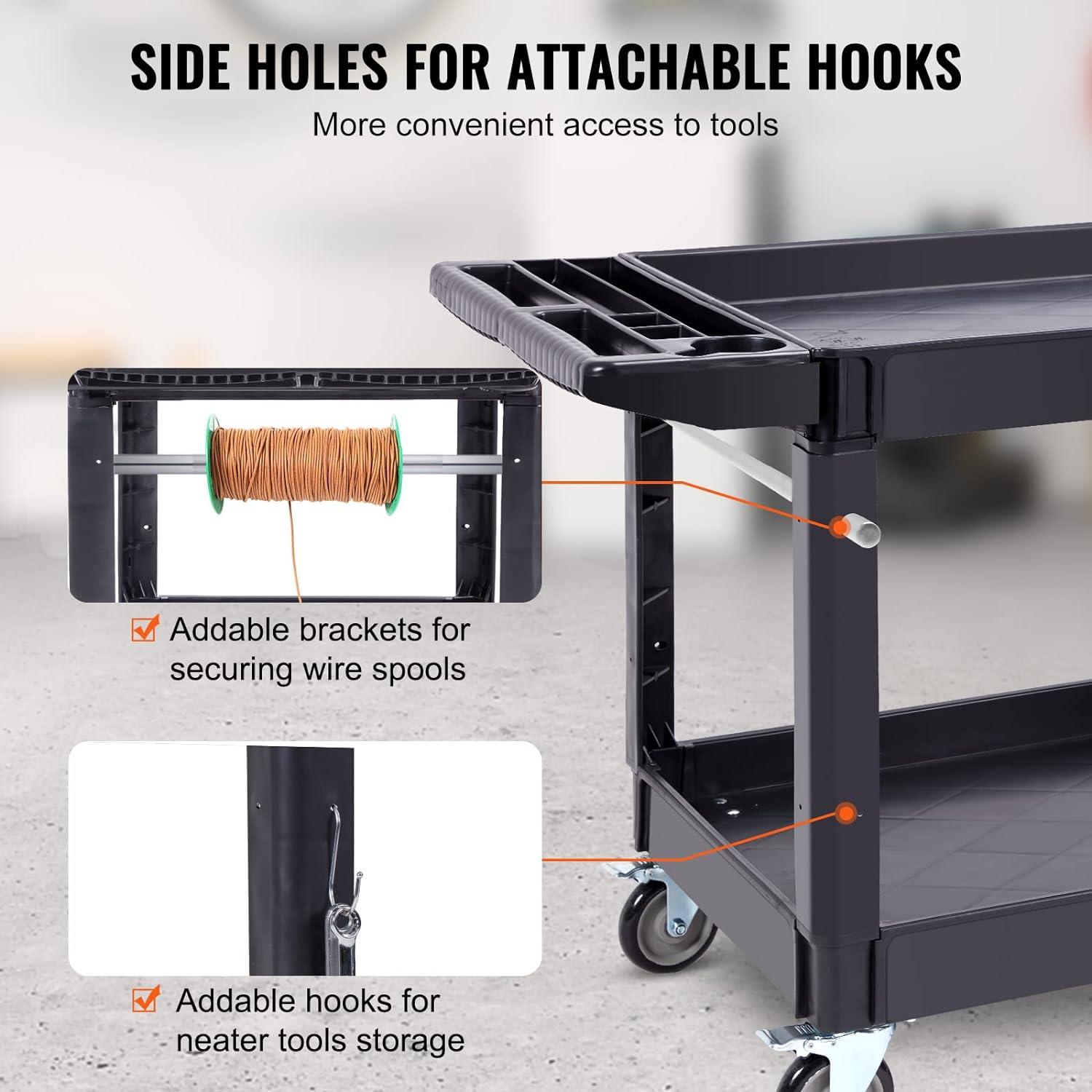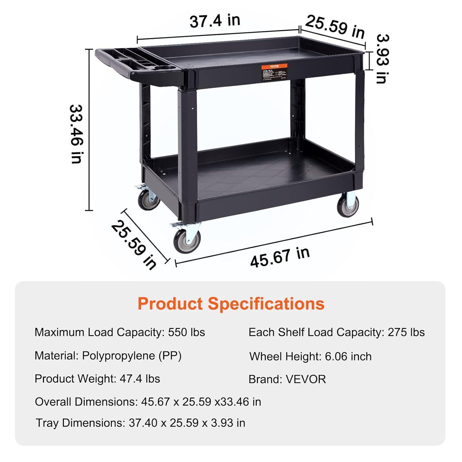 【Strong Weight Capacity】VEVOR 2 shelf utility cart can effortless transport 550 lbs heavy loads, such as oversized cartons, large filing cabinets, and hefty toolboxes. Quality polypropylene material is corrosion-resistant, impervious to debris, and easy to clean. High-density structural foam construction makes this utility cart sturdy, lightweight, and maneuverable, ideal for long-term heavy-duty transportation needs.