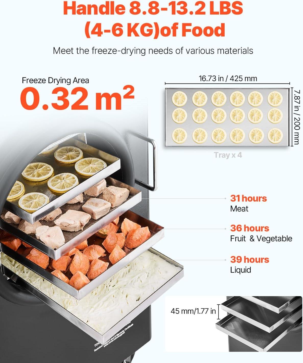 Large Capacity: The freeze dryer utilizes an 8.8-13.2 lbs (4-6 kg) capacity with a 4-layer tray design, handling substantial batches of food for long-term storage. It is suitable for freeze-drying meat, seafood, vegetables, and fruits. The vacuum freeze-drying technology retains the nutrition, flavor, and texture of the food