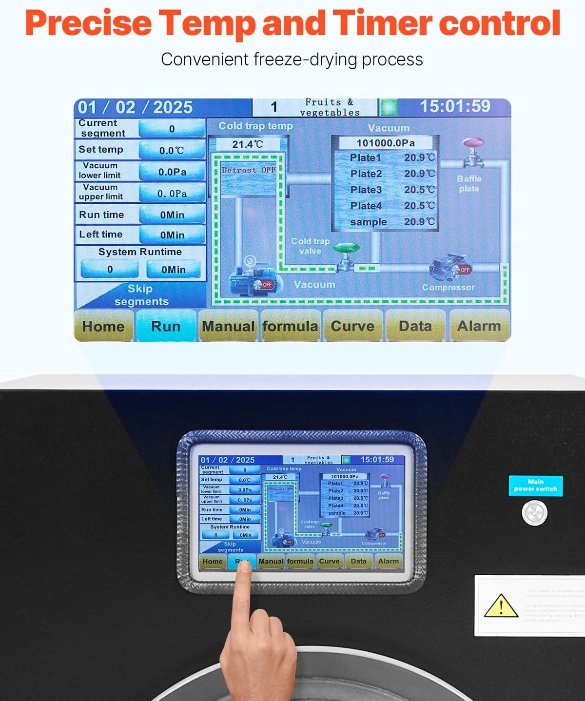 Efficient Freeze Drying: Thanks to the powerful compressor, the freeze drying machine cools quickly. The -35°C cold trap temperature ensures effective water removal during the freeze-drying process. Paired with a strong vacuum pump, it maintains optimal vacuum conditions and prevents compatibility issues with the vacuum pump
