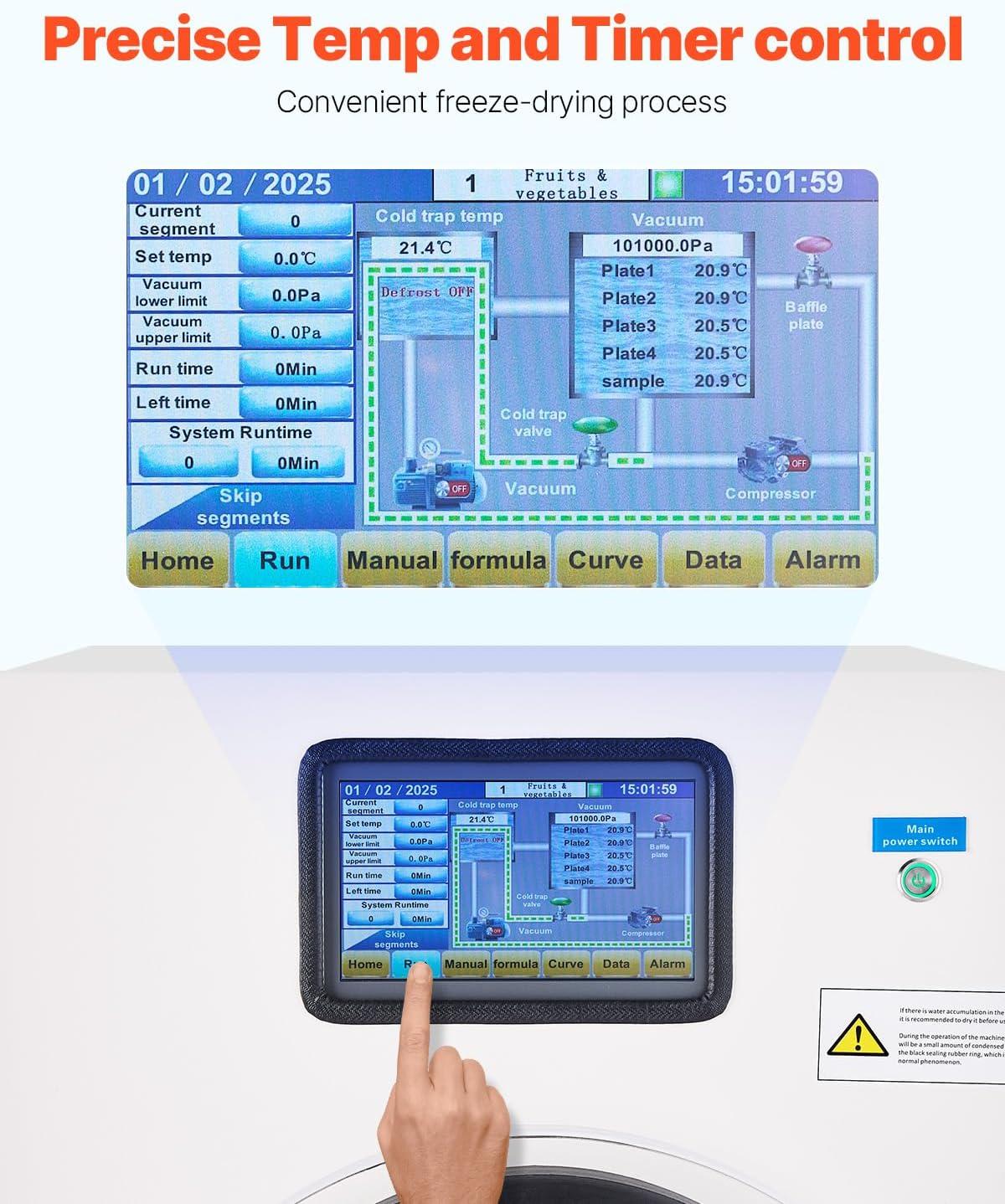 Efficient Freeze Drying: Thanks to the powerful compressor, the freeze drying machine cools quickly. The -35°C cold trap temperature ensures effective water removal during the freeze-drying process. Paired with a strong vacuum pump, it maintains optimal vacuum conditions and prevents compatibility issues with the vacuum pump