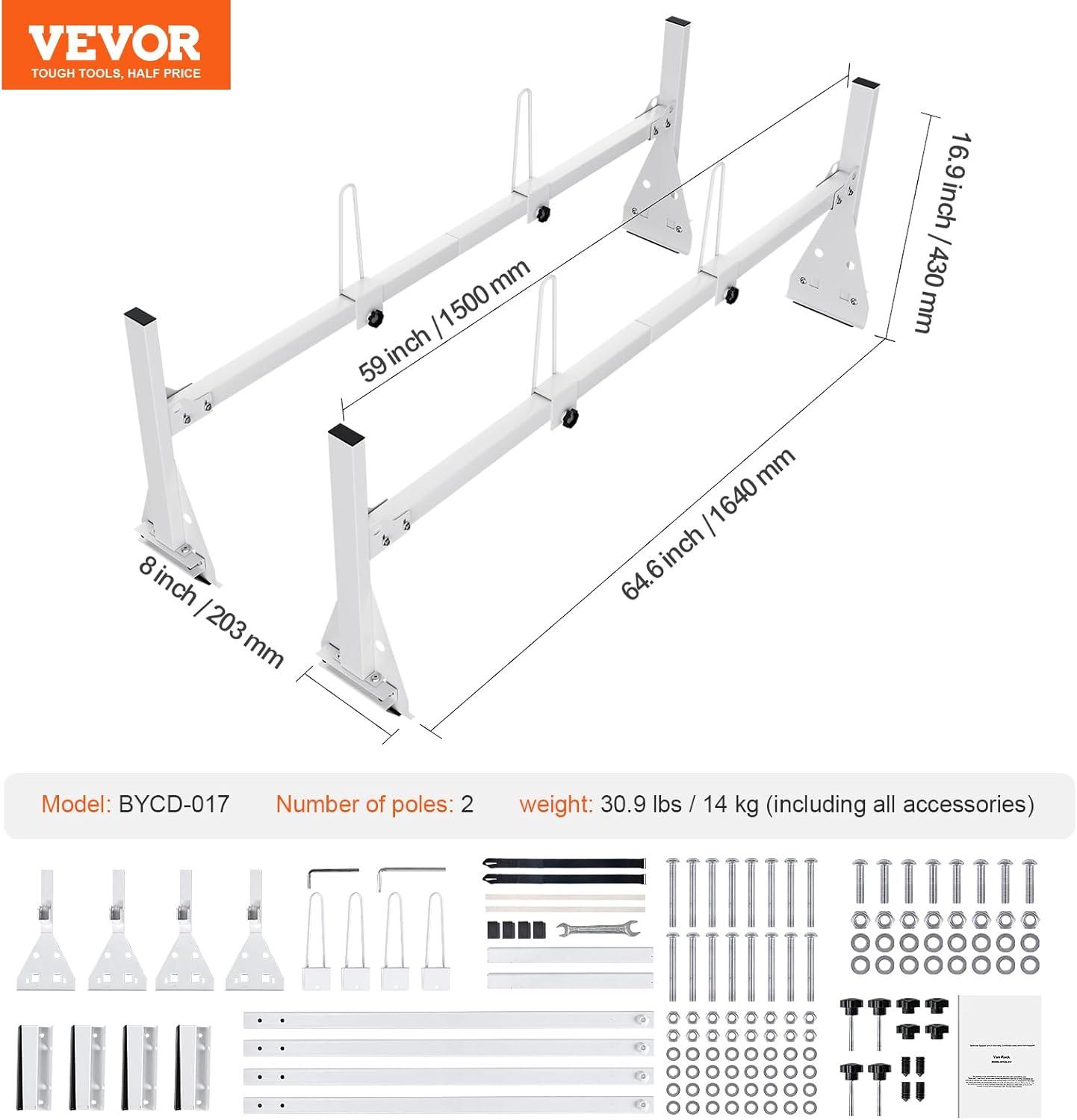 VEVOR Van Roof Ladder Racks - 59" Adjustable Heavy-Duty Steel Racks, 600 lbs Capacity for Chevrolet Express 1500 2500 3500/Ford E150 E250 E350/GMC Savana, 2 Bars(2 Bars)