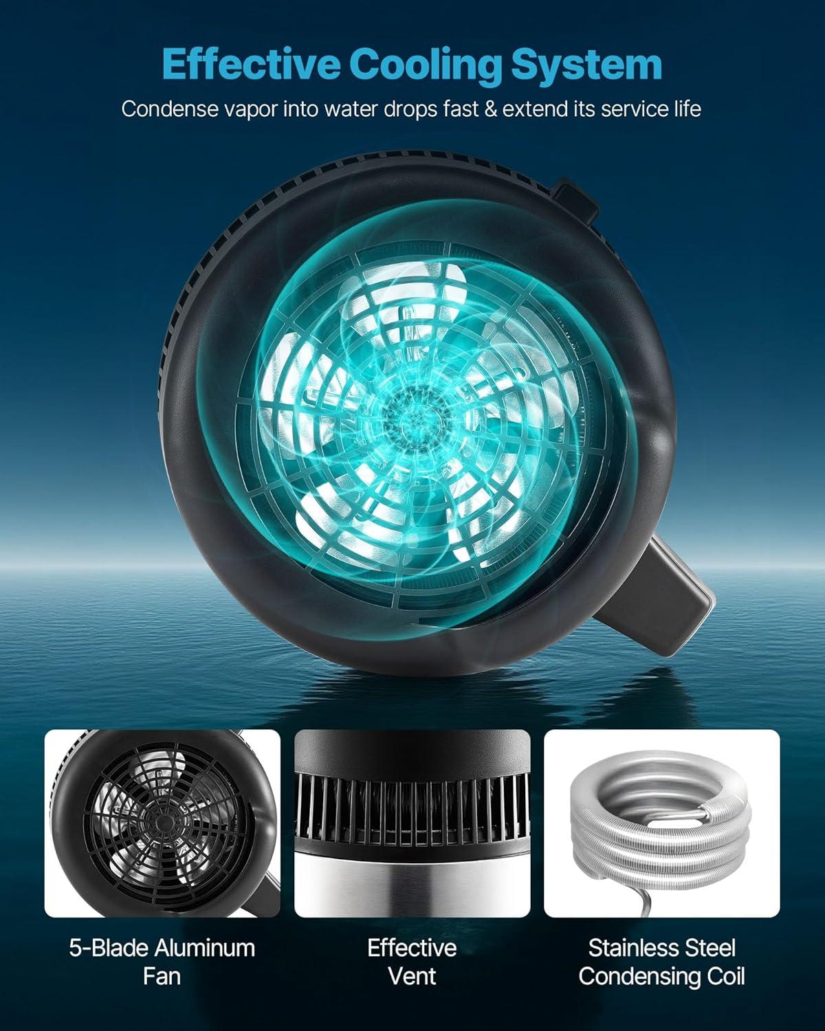 Effective Cooling: The upgraded distilled water machine's top four-blade fan is made of aluminum, replacing the fragile plastic, and the exhaust cover has also been upgraded to 304 stainless steel, ensuring heat dissipation and a long service life