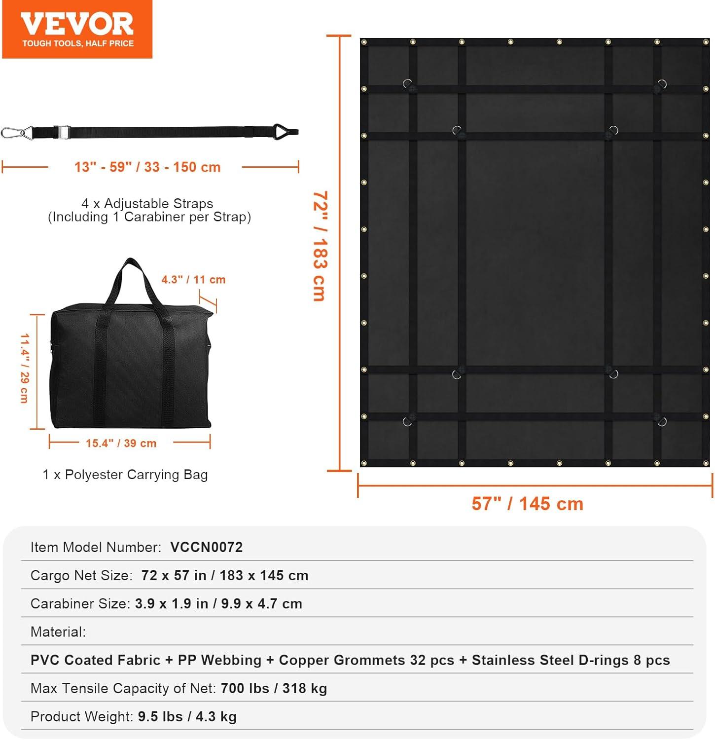 VEVOR Waterproof Cargo Net, 72 in x 57 in, Heavy Duty Truck Cargo Net-(WLL) 700lbs, 4 Adjustable Straps with Carabiners & S-Hooks, Truck Bed Cover for Trailer, Pickup, Boat, Jeep, SUV 4.75′ x 6′ ft(4.2′ x 5.5′)