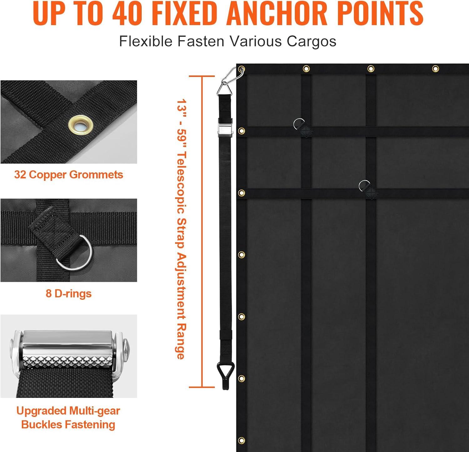 Flexible Adaption to Various Cargos: VEVOR weatherproof cargo net comes with up to 40 metal fixed points, equipped with 13″ – 59″ adjustable straps and multi-gear buckles. So you can use the equipped metal buckles to adjust the fixed points according to the different sizes and shapes of the cargos as needed. Upgraded multi-gear buckles can improve the stability of the telescopic straps, are not easy to loosen, and are suitable for heavy or irregular cargos use.
