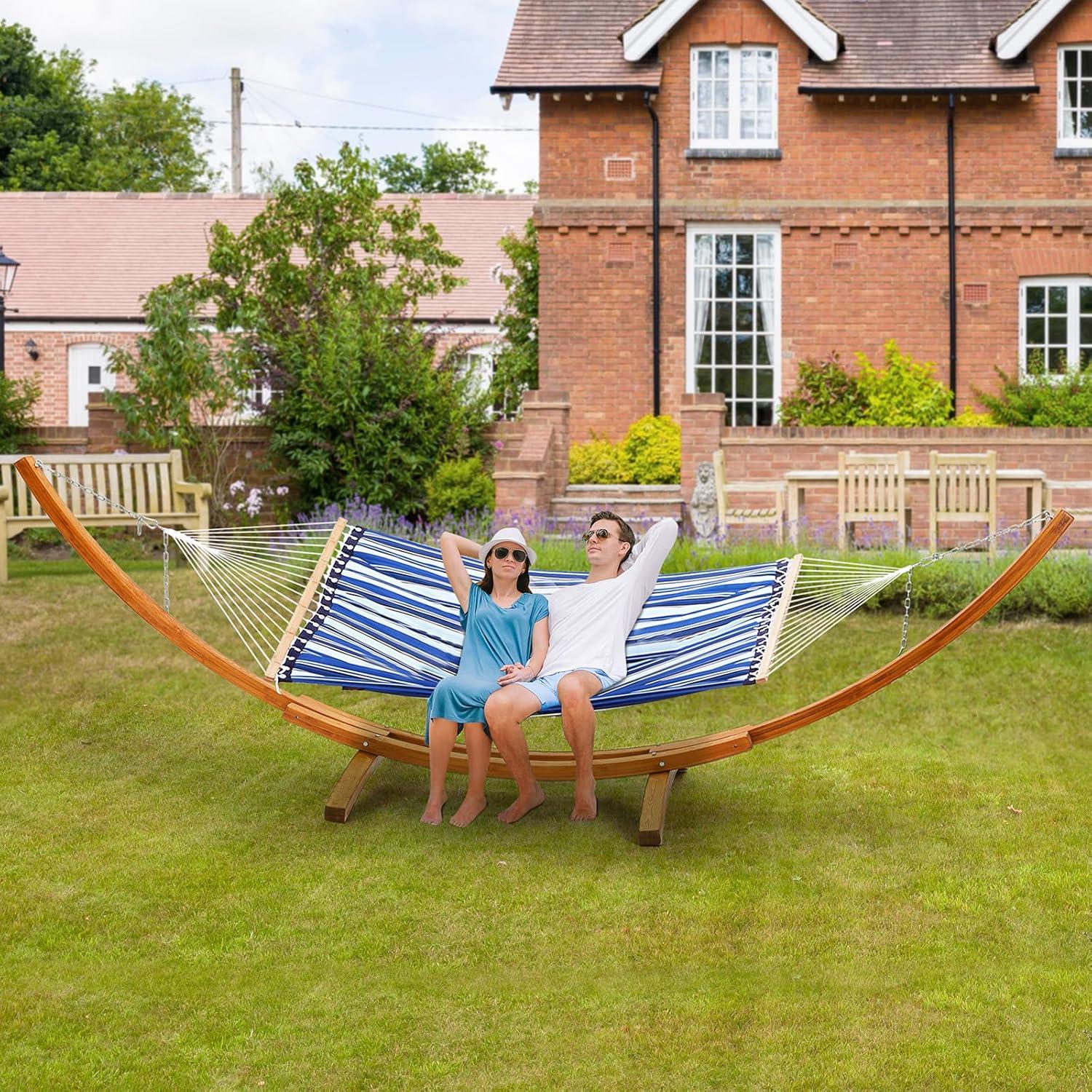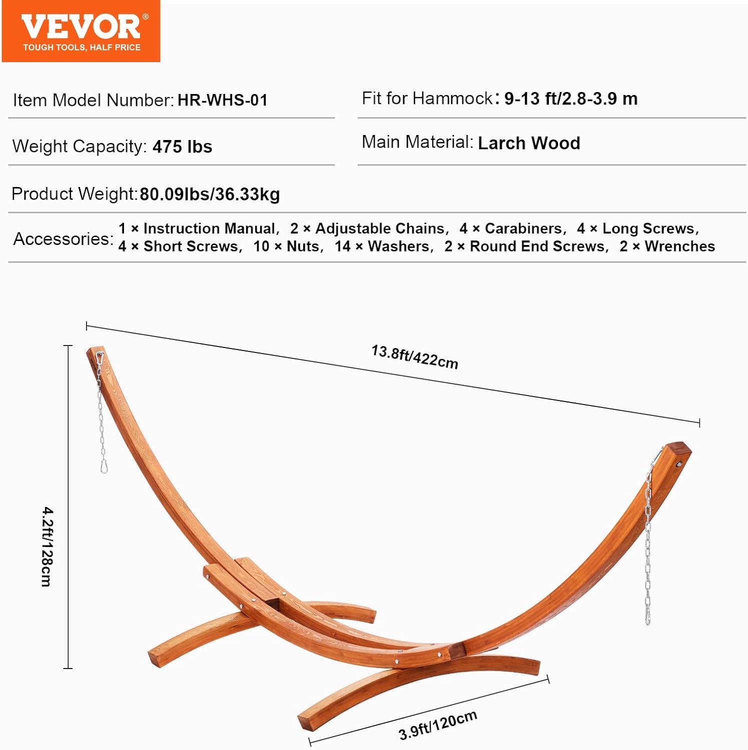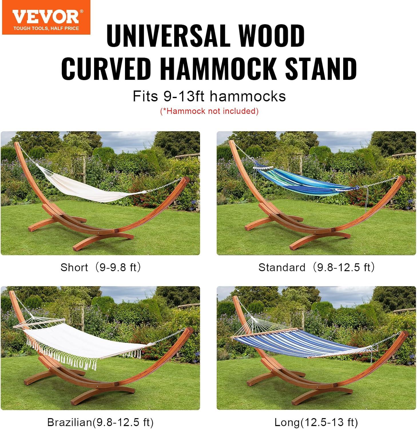 Versatile Hammock Compatibility: Our 165-inch wooden hammock stand supports hammocks ranging from 9 to 13 feet in length, accommodating single Brazilian hammocks, quilted hammocks, and large family mesh hammocks for camping. Overall dimensions: 166.1'' (L) x 47.2'' (W) x 50.3'' (H). Note: Hammock not included.
